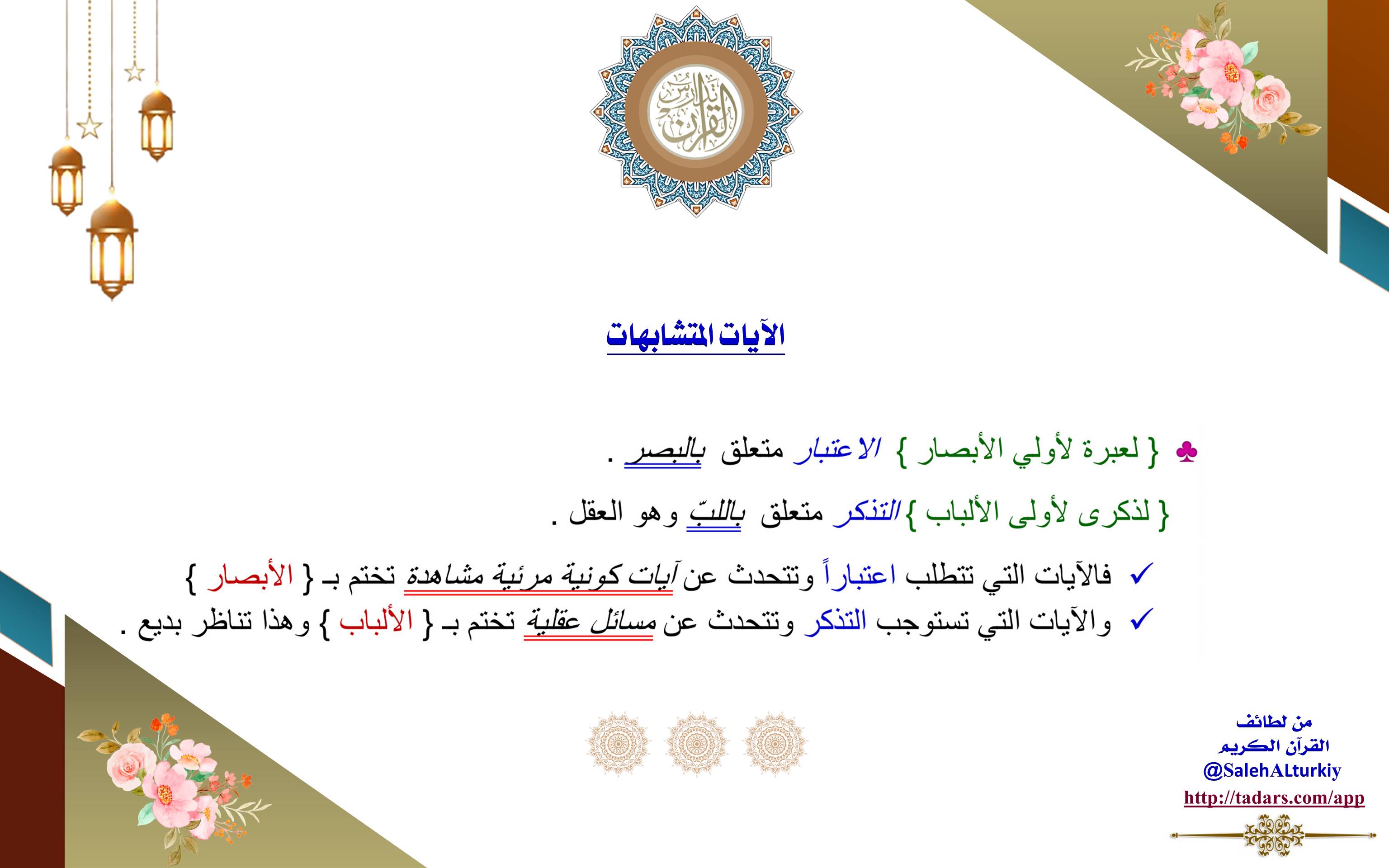والآيات التي تستوجب التذكر وتتحدث عن مسائل عقلية تختم بـ {الألباب} وهذا تناظر بديع.