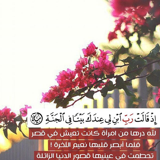 ﴿ وَضَرَبَ اللَّهُ مَثَلًا لِّلَّذِينَ آمَنُوا امْرَأَتَ فِرْعَوْنَ إِذْ قَالَتْ رَبِّ ابْنِ لِي عِندَكَ بَيْتًا فِي الْجَنَّةِ وَنَجِّنِي مِن فِرْعَوْنَ وَعَمَلِهِ وَنَجِّنِي مِنَ الْقَوْمِ الظَّالِمِينَ ﴿١١﴾ ﴾