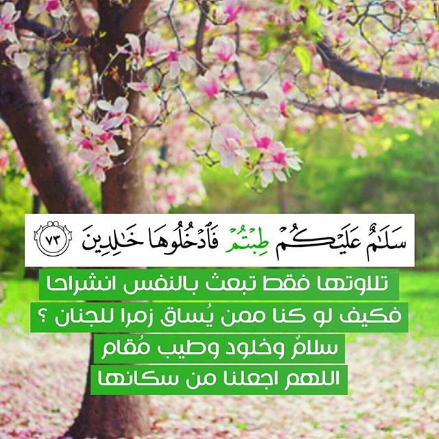 ﴿ وَسِيقَ الَّذِينَ اتَّقَوْا رَبَّهُمْ إِلَى الْجَنَّةِ زُمَرًا حَتَّى إِذَا جَاءُوهَا وَفُتِحَتْ أَبْوَابُهَا وَقَالَ لَهُمْ خَزَنَتُهَا سَلَامٌ عَلَيْكُمْ طِبْتُمْ فَادْخُلُوهَا خَالِدِينَ ﴿٧٣﴾ ﴾