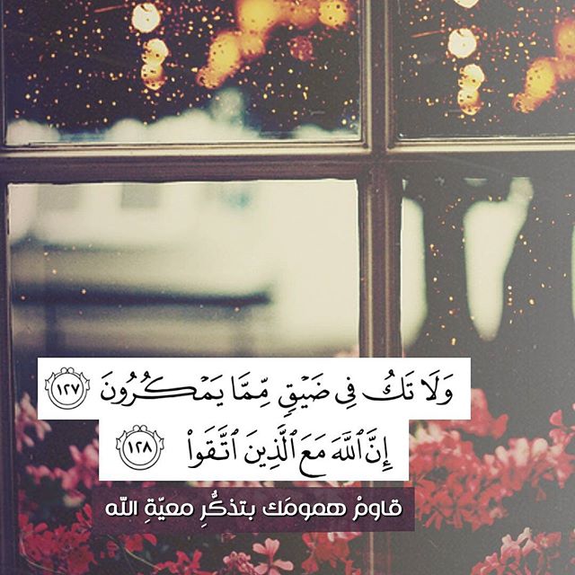 " ولا تكُ في ( ضيق ) مما يمكرون إن اللهَ ( مع ) الذين اتقوا". قاومْ همومَك بتذكُّرِ معيّةِ الله.