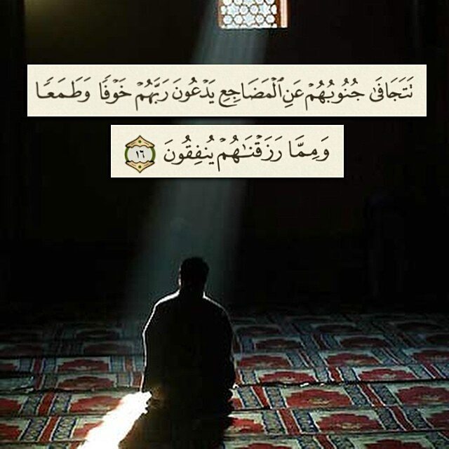 ﴿تَتَجَافَى جُنُوبُهُمْ عَنِ الْمَضَاجِعِ يَدْعُونَ رَبَّهُمْ خَوْفًا وَطَمَعًا وَمِمَّا رَزَقْنَاهُمْ يُنفِقُونَ ﴿١٦﴾ ﴾