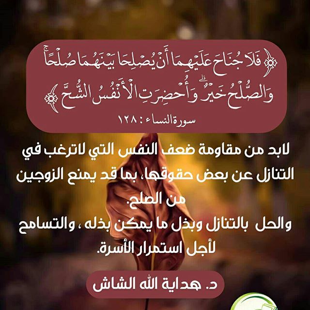 لا بد من مقاومة ضعف النفس التي لا ترغب في التنازل عن بعض حقوقها بما قد يمنع الزوجين من الصلح والحل بالتنازل وبذل ما يمكن بذله والتسامح لاجل استمرار الاسرة
