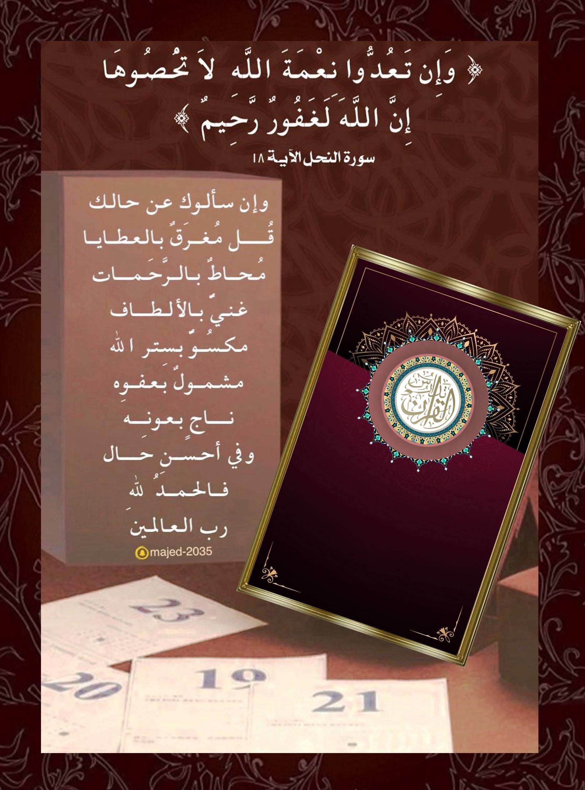 وإن سألوك عن حالك: قل مُغرقٌ بالعطايا مُحاطٌ بالرحمات غنيٌ بالألطاف مكسوٌ بستر الله مشمولٌ بعفوه، ناجٍ بِعونه، وفي أحسن حال .. فالحمدُ لله رب العالمين.
