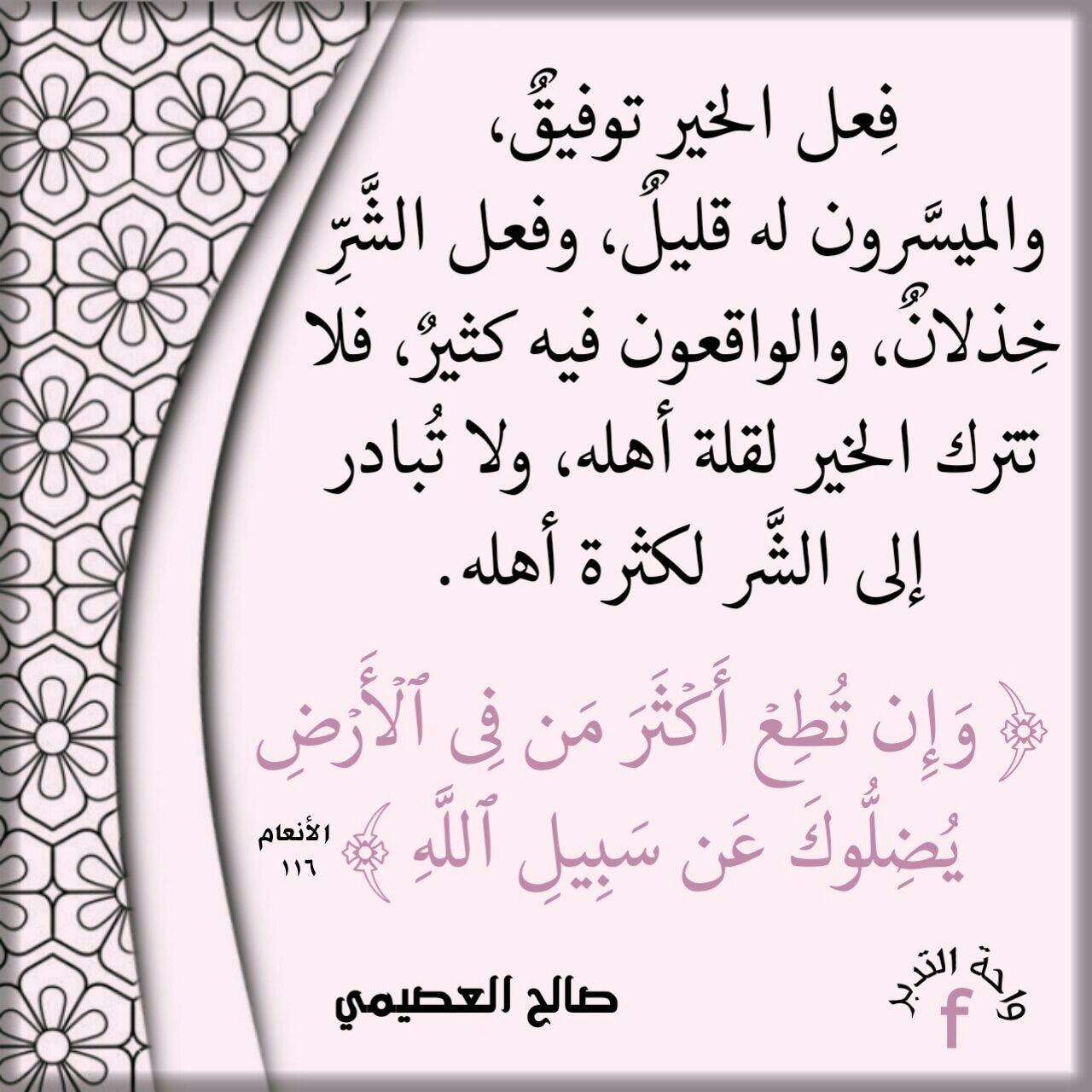 فِعل الخير توفيقٌ، والميسَّرون له قليلٌ، وفعل الشَّرِّ خِذلانٌ، والواقعون فيه كثيرٌ، فلا تترك الخير لقلة أهله، ولا تُبادر إلى الشَّر لكثرة أهله.