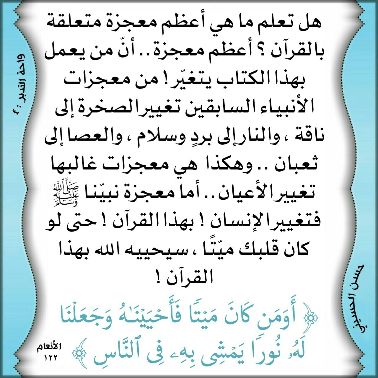 هل تعلم ما هي أعظم معجزة متعلقة بالقرآن؟ أعظم معجزة .. أنّ من يعمل بهذا الكتاب يتغيّر! من معجزات الأنبياء السابقين تغيير الصخرة إلى ناقة، والنار إلى بردٍ وسلام، والعصا إلى ثعبان .. وهكذا هي معجزات غالبها تغيير الأعيان .. أما معجزة نبيّنا (ﷺ) فتغيير الإنسان! بهذا القرآن!. حتى لو كان قلبك ميّتًا، سيحييه الله بهذا القرآن!.