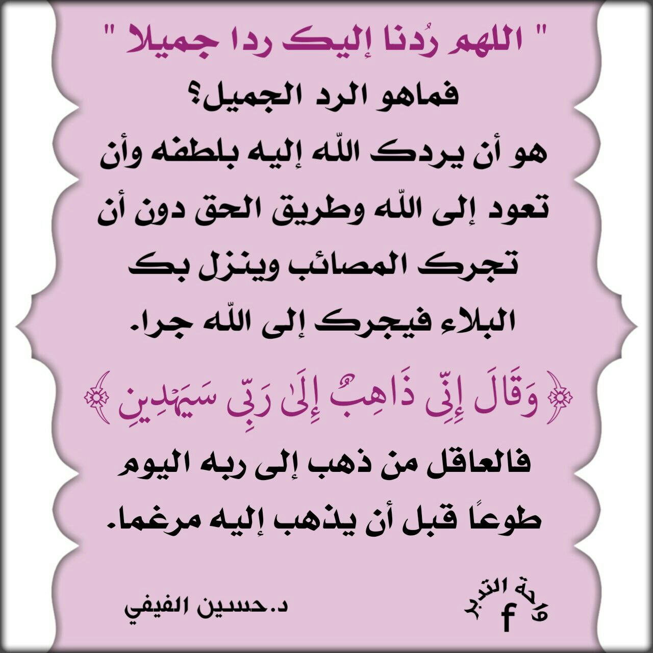 "اللهم رُدنا إليك ردا جميلاً" فما هو الرد الجميل؟ هو أن يردك الله إليه بلطفه وأن تعود إلى الله وطريق الحق دون أن تجرك المصائب وينزل بك البلاء فيجرك إلى الله جرا. (وَقَالَ إِنِّي ذَاهِبٌ إِلَى رَبِّي سَيَهْدِينِ): فالعاقل من ذهب إلى ربه اليوم طوعًا قبل أن يذهب إليه مرغما.
