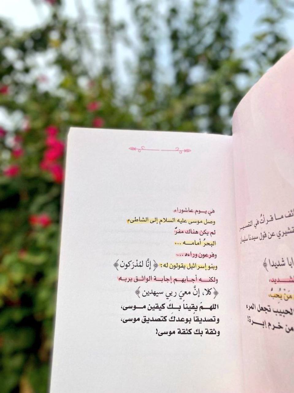 في يوم عاشوراء .. وصل موسى عليه السلام إلى الشاطيء لم يكن هناك مفرٌ؛ البحر أمامه، وفرعون وراءه، وبنو إسرائيل يقولون له: (إِنَّا لَمُدْرَكُونَ) ولكنه أجابهم إجابة الواثق بربه (كَلَّا، إِنَّ مَعِيَ رَبِّي سَيَهْدِينِ) .. اللهم يقيناً بكَ كيقين موسى، وتصديقاً بوعدكَ كتصديق موسى، وثقة بك كثقة موسى!