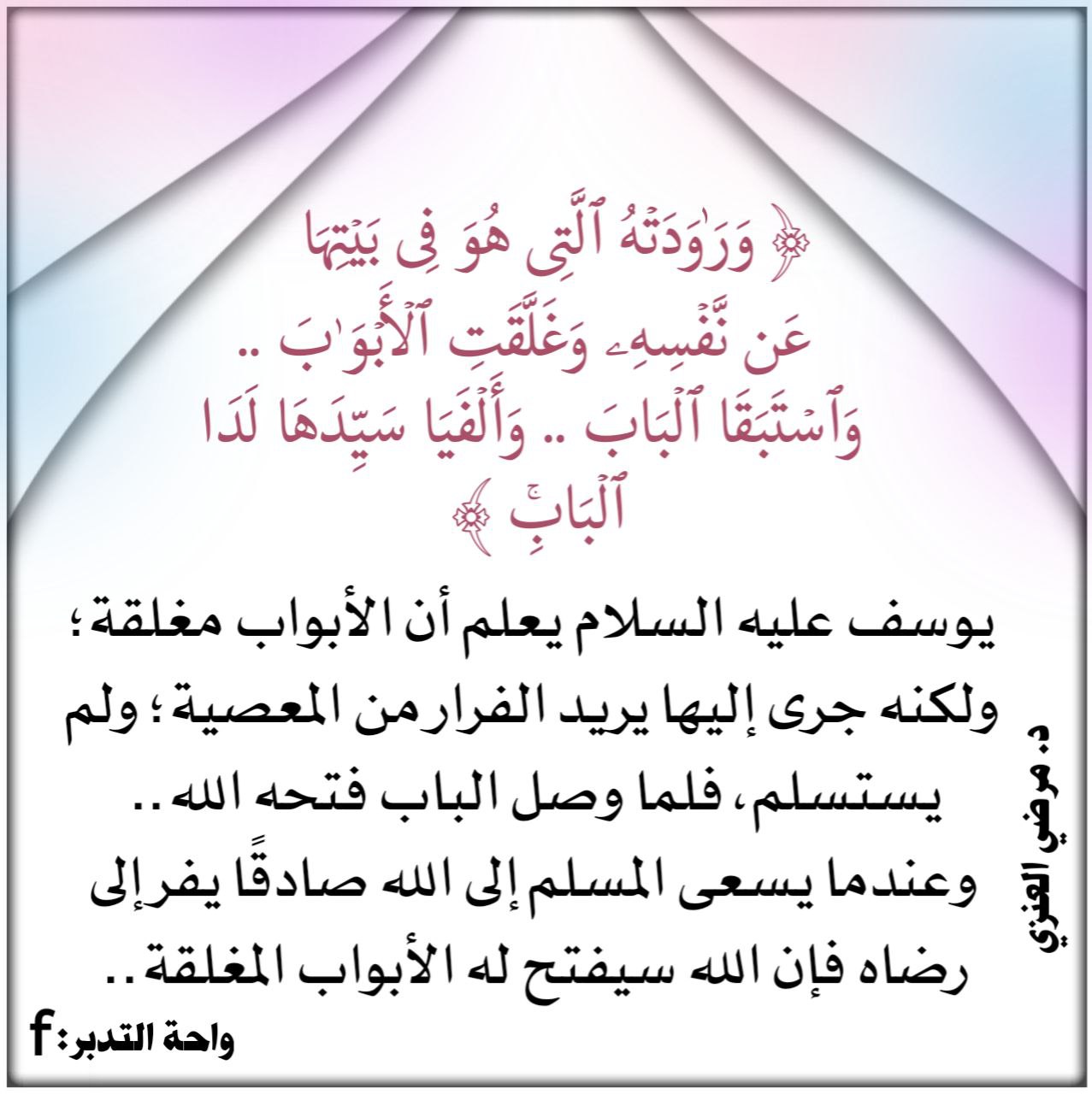 يوسف عليه السلام يعلم أن الأبواب مغلقة؛ ولكنه جرى إليها يريد الفرار من المعصية؛ ولم يستسلم، فلما وصل الباب فتحه الله .. وعندما يسعى المسلم إلى الله صادقًا يفر إلى رضاه فإن الله سيفتح له الأبواب المغلقة.