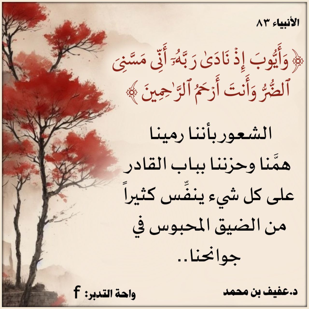 ﴿وَأَيُّوبَ إِذْ نَادَى رَبَّهُ أَنِّي مَسَّنِيَ الضُّرُّ وَأَنتَ أَرْحَمُ الرَّاحِمِينَ﴾