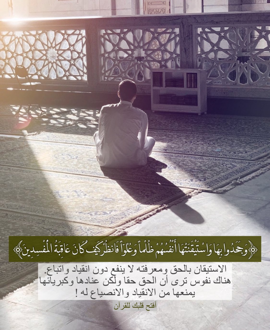 الاستيقان بالحق ومعرفته لا ينفع دون انقياد واتباع. هناك نفوس ترى أن الحق حقا ولكن عنادها وكبريائها يمنعها من الانقياد والانصياع له !