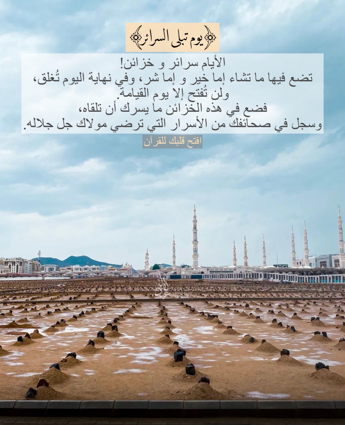 الأيام سرائر وخزائن! تضع فيها ما تشاء إما خير وإما شر، وفي نهاية اليوم تُغلق، ولن تُفتح إلا يوم القيامة. فضع في هذه الخزائن ما يسرك أن تلقاه، وسجل في صحائفك من الأسرار التي ترضي مولاك جل جلاله.