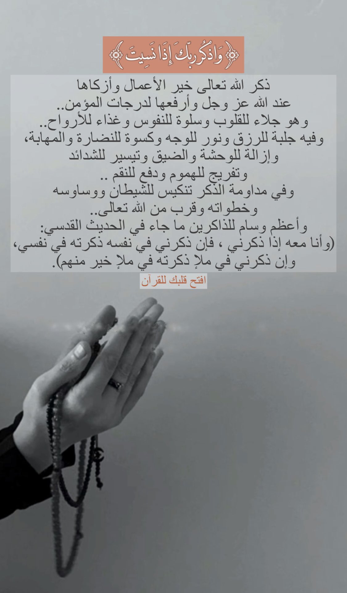 ذكر الله تعالى خير الأعمال وأزكاها عند الله عز وجل وأرفعها لدرجات المؤمن .. وهو جلاء للقلوب وسلوة للنفوس وغذاء للأرواح .. وفيه جلبة للرزق ونور للوجه وكسوة للنضارة والمهابة، وإزالة للوحشة والضيق وتيسير للشدائد وتفريج للهموم ودفع للنقم .. وفي مداومة الذكر تنكيس للشيطان ووساوسه وخطواته وقرب من الله تعالى .. وأعظم وسام للذاكرين ما جاء في الحديث القدسي: (وأنا معه إذا ذكرني، فإن ذكرني في نفسه ذكرته في نفسي، وإن ذكرني في ملأ ذكرته في ملأ خير منهم).