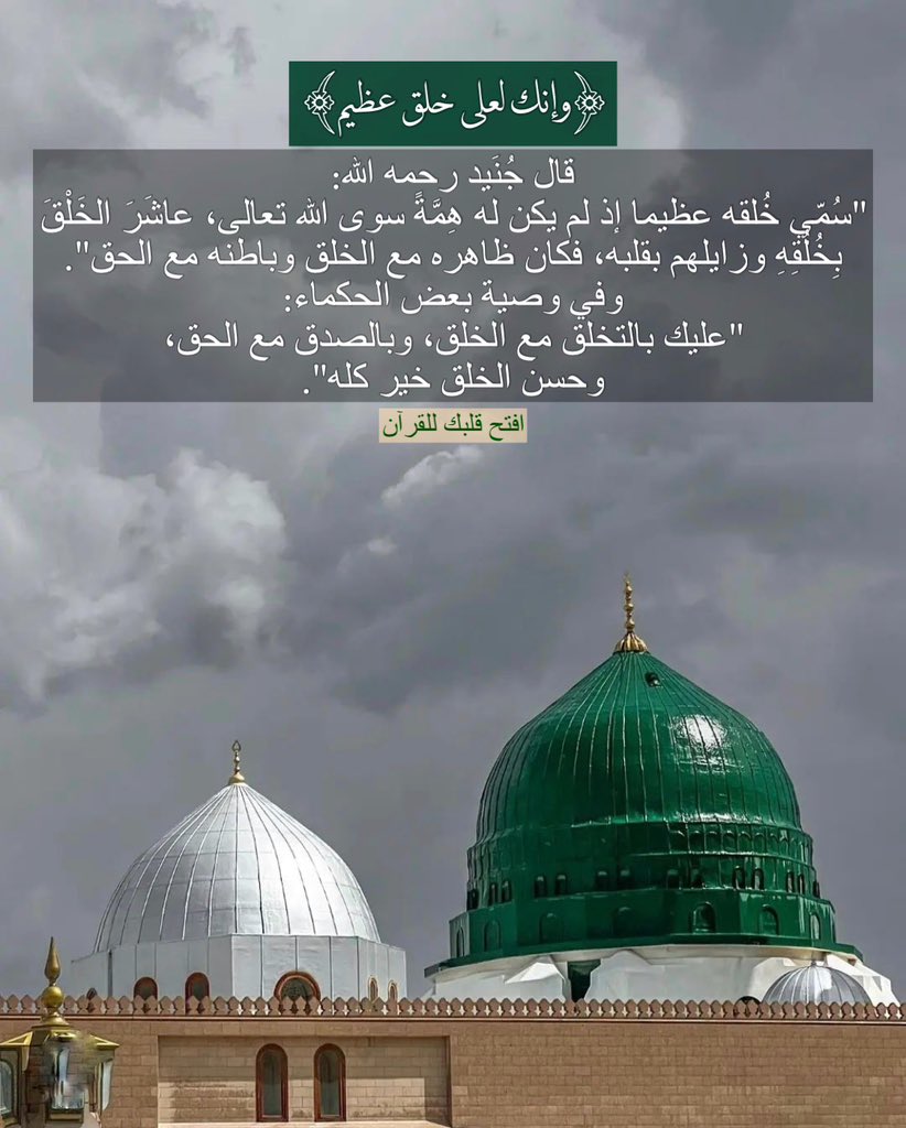 قال جُنَيد رحمه الله: "سُمّي خُلقه عظيما إذ لم يكن له هِمَّةً سوى الله تعالى، عاشَرَ الخَلْقَ بِخُلُقِهِ وزايلهم بقلبه، فكان ظاهره مع الخلق وباطنه مع الحق".