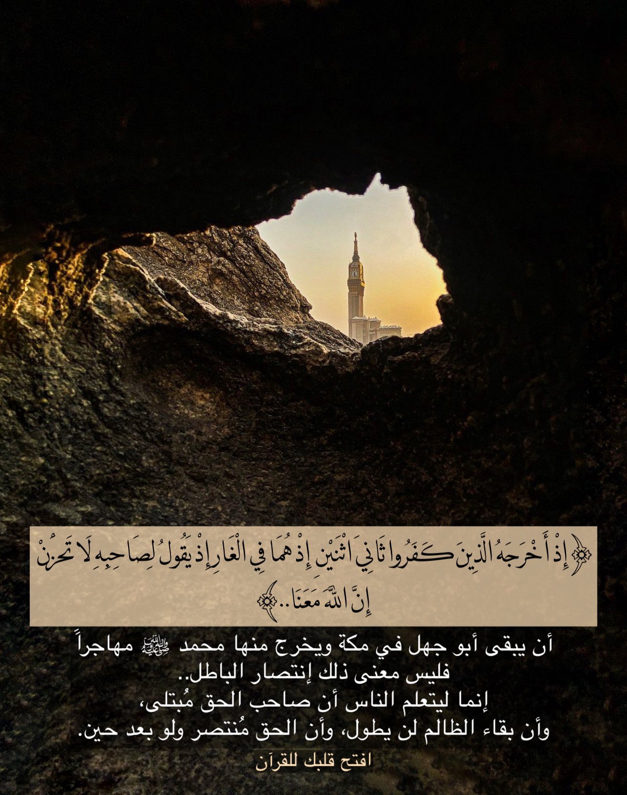 ﴿إِذْ أَخْرَجَهُ الَّذِينَ كَفَرُوا ثَانِيَ اثْنَيْنِ إِذْ هُمَا فِي الْغَارِ إِذْ يَقُولُ لِصَاحِبِهِ لَا تَحْزَنْ إِنَّ اللَّهَ مَعَنَا﴾