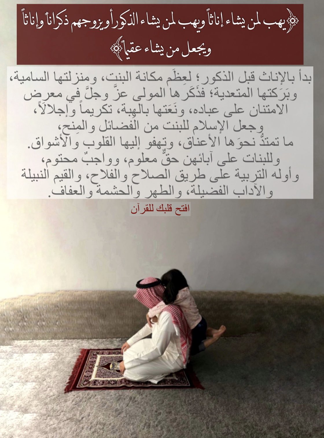 بدأ بالإناث قبل الذكور؛ لعِظَم مكانة البنت، ومنزلتها السامية، وبَرَكتها المتعدية؛ فذَكَرها المولى عزّ وجلَّ في معرض الامتنان على عباده، ونَعَتها بالهِبة، تكريماً وإجلالَاً، وجعل الإسلام للبنت من الفضائل والمنح، ما تمتدُّ نحوَها الأعناق، وتهفو إليها القلوب والأشواق. وللبنات على آبائهن حقٌّ معلوم، وواجبٌ محتوم، وأوله التربية على طريق الصلاح والفلاح، والقيم النبيلة والآداب الفضيلة، والطهر والحشمة والعفاف.