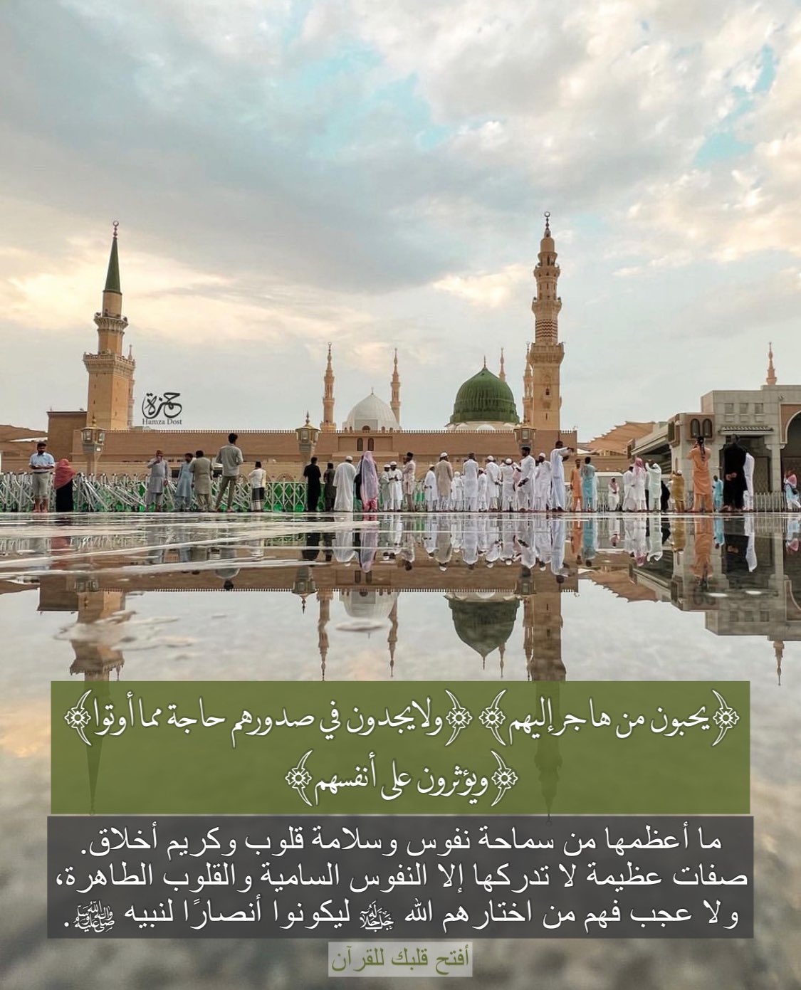 ﴿ يُحِبُّونَ مَنْ هَاجَرَ إِلَيْهِمْ وَلَا يَجِدُونَ فِي صُدُورِهِمْ حَاجَةً مِّمَّا أُوتُوا وَيُؤْثِرُونَ عَلَى أَنفُسِهِمْ﴾
