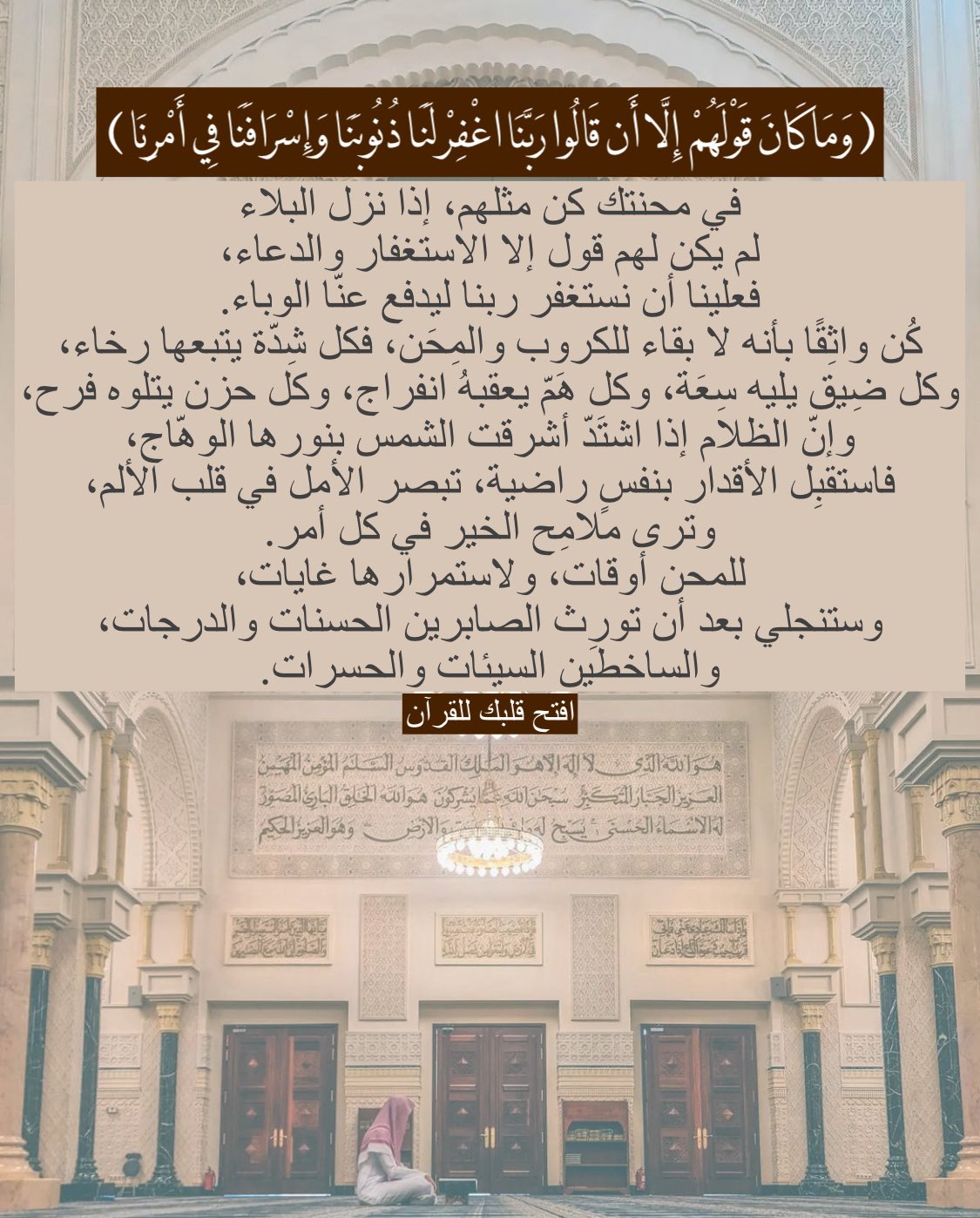 في محنتك كن مثلهم، إذا نزل البلاء لم يكن لهم قول إلا الاستغفار والدعاء، فعلينا أن نستغفر ربنا ليدفع عنّا الوباء. كُن واثقًا بأنه لا بقاء للكروب والمِحَن، فكل شدّة يتبعها رخاء، وكل ضيق يليه سِعَة، وكل هم يعقبهُ انفراج ، وكل حزن يتلوه فرح، وإنّ الظلام إذا اشتَدّ أشرقت الشمس بنورها الوهّاج، فاستقبِل الأقدار بنفس راضية، تبصر الأمل في قلب الألم، وتري ملامِح الخير في كل أمر. للمحن أوقات، ولاستمرارها غايات، وستنجلي بعد أن تورِث الصابرين الحسنات والدرجات، والساخطين السيئات والحسرات.