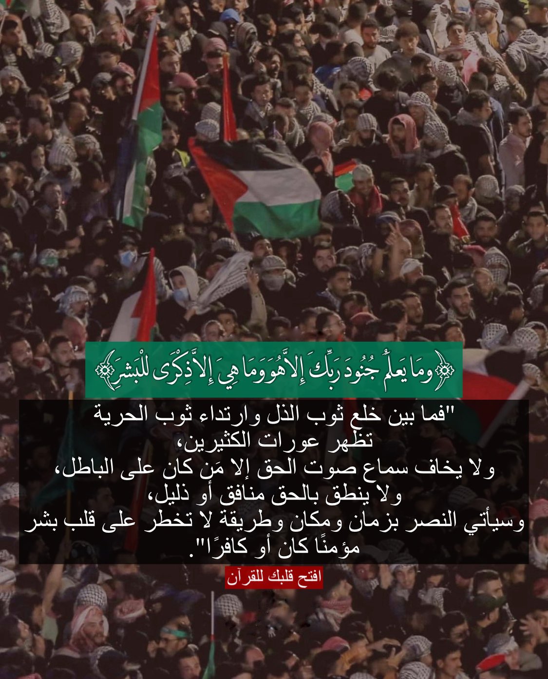 "فما بين خلع ثوب الذل وارتداء ثوب الحرية تظهر عورات الكثيرين، ولا يخاف سماع صوت الحق إلا مَن كان على الباطل، ولا ينطق بالحق منافق أو ذليل، وسيأتي النصر بزمان ومكان وطريقة لا تخطر على قلب بشر مؤمنًا كان أو كافرًا".