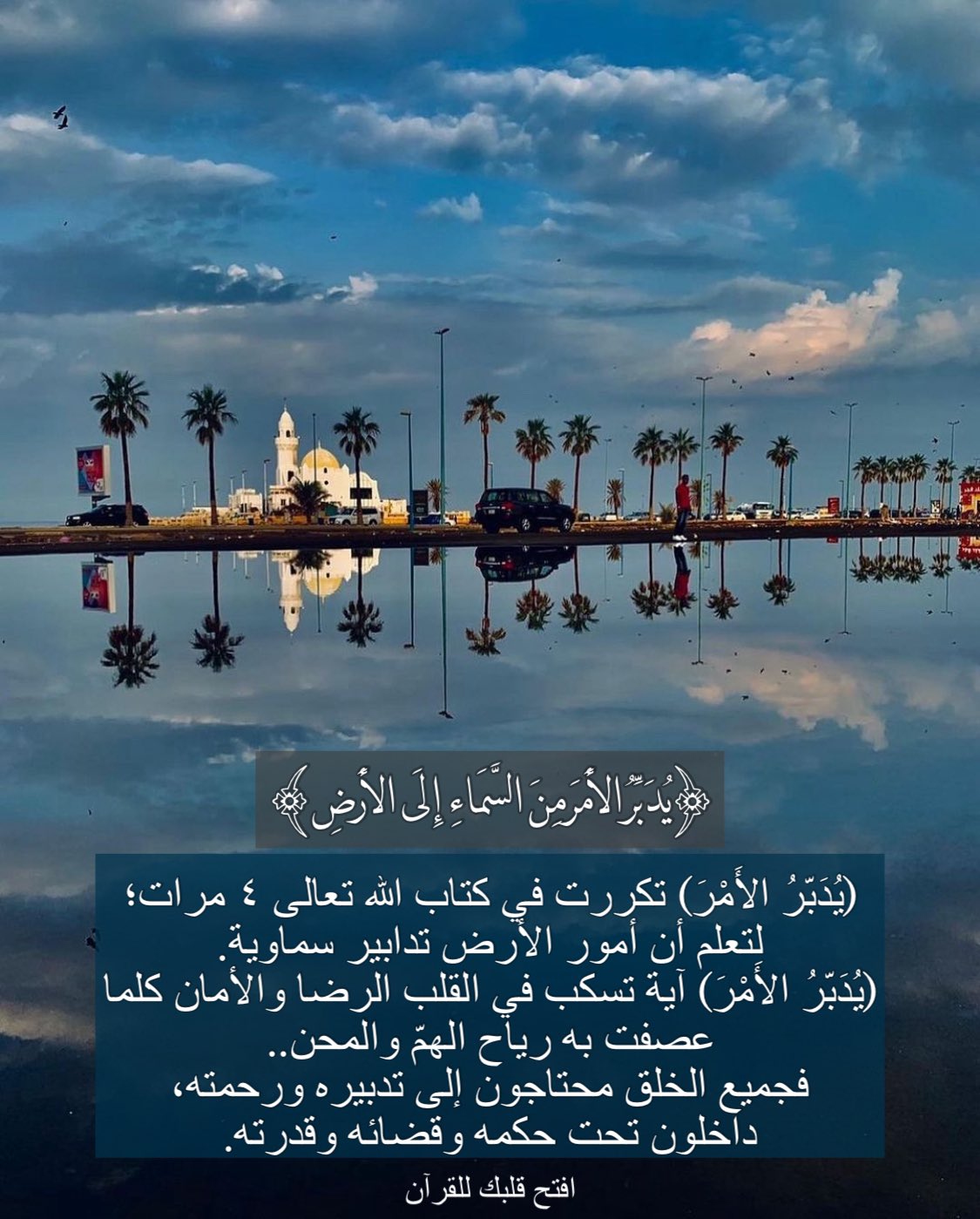 (يُدَبِّرُ الْأَمْرَ) آية تسكب في القلب الرضا والأمان كلما عصفت به رياح الهمّ والمحن .. فجميع الخلق محتاجون إلى تدبيره ورحمته، داخلون تحت حكمه وقضائه وقدرته.