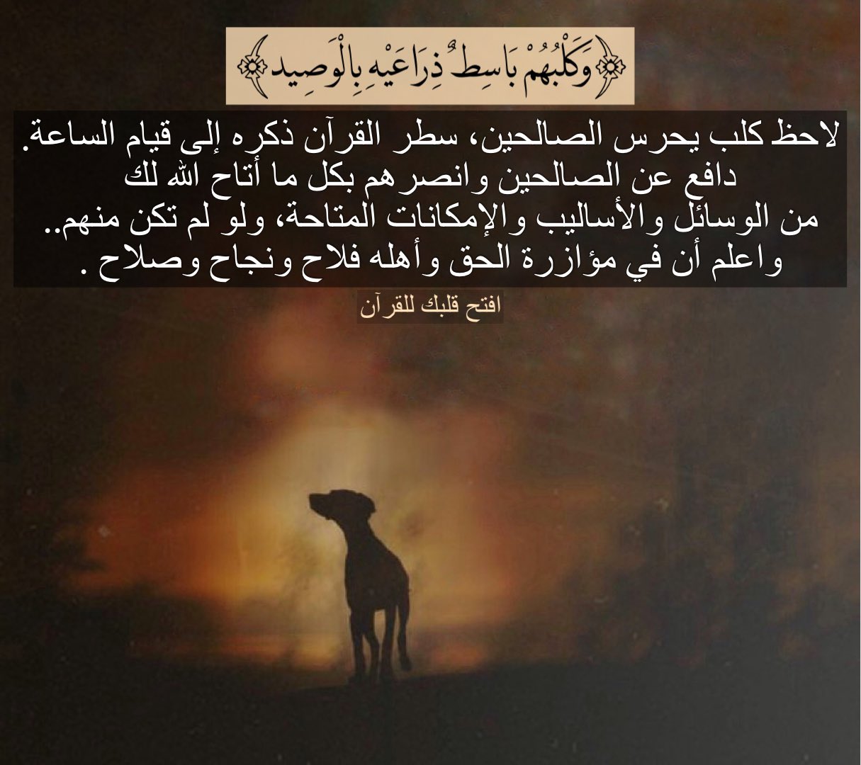 لاحظ كلب يحرس الصالحين، سطر القرآن ذكره إلى قيام الساعة. دافع عن الصالحين وانصرهم بكل ما أتاح الله لك من الوسائل والأساليب والإمكانات المتاحة، ولو لم تكن منهم .. واعلم أن في مؤازرة الحق وأهله فلاح ونجاح وصلاح.