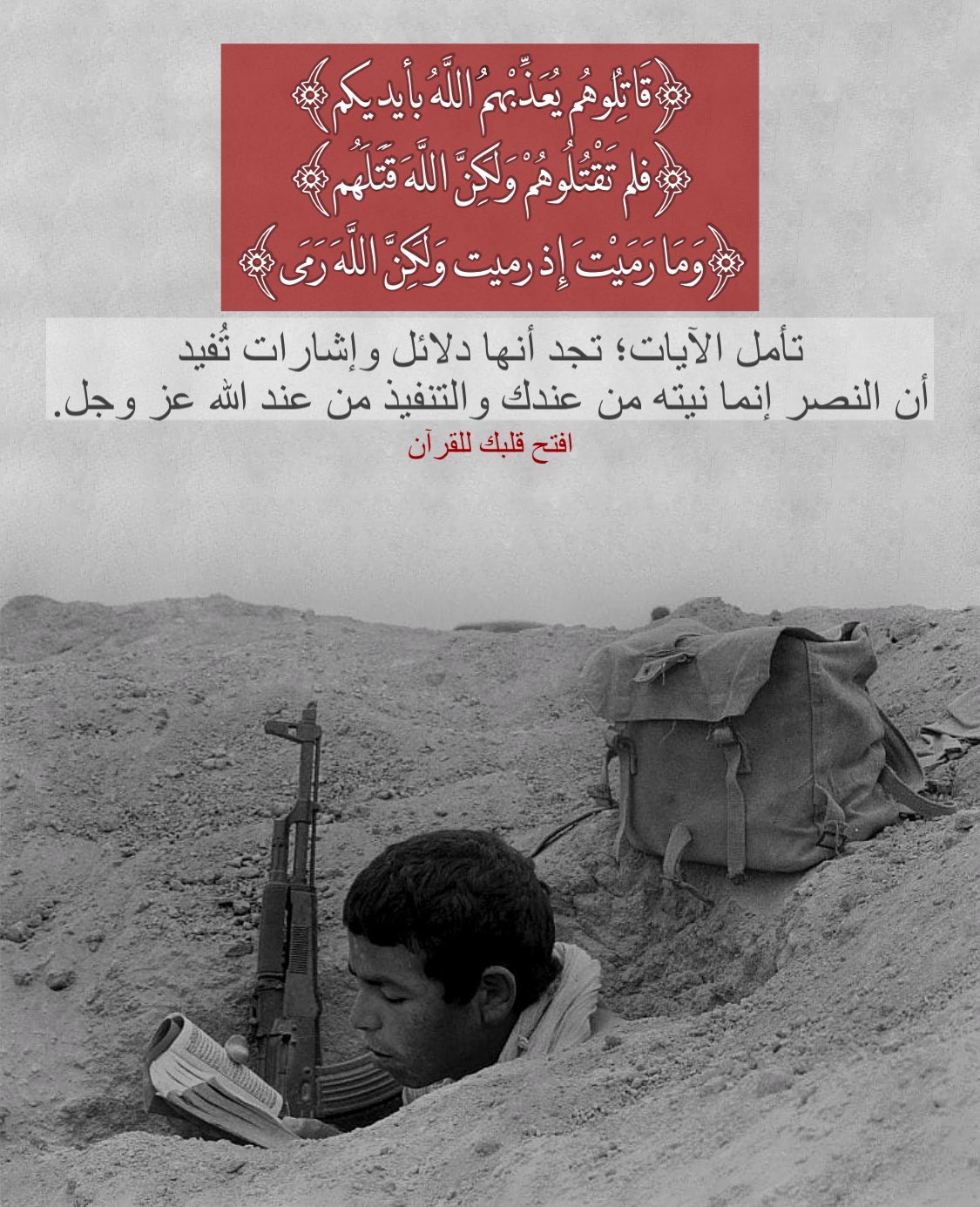 ﴿قَاتِلُوهُمْ يُعَذِّبْهُمُ اللَّهُ بِأَيْدِيكُمْ﴾ ، ﴿فَلَمْ تَقْتُلُوهُمْ وَلَكِنَّ اللَّهَ قَتَلَهُمْ﴾ ، ﴿وَمَا رَمَيْتَ إِذْ رَمَيْتَ وَلَكِنَّ اللَّهَ رَمَى﴾