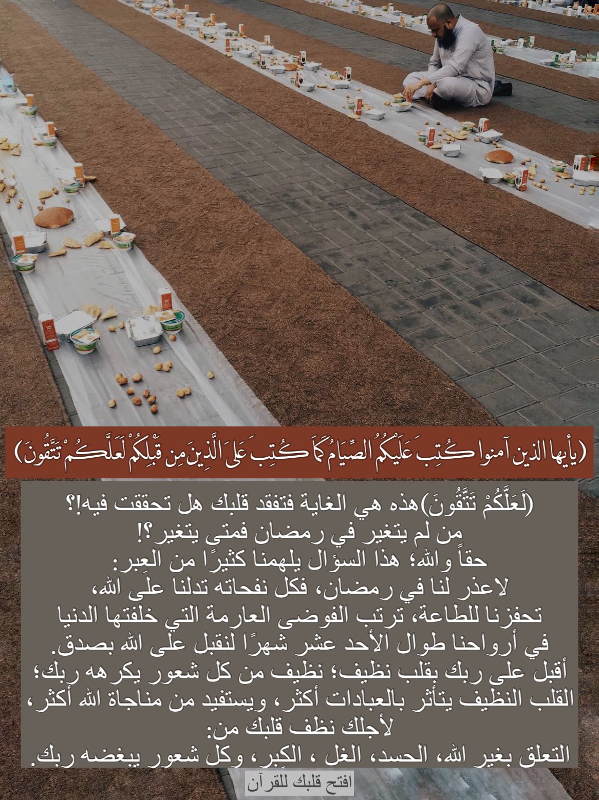 (لَعَلَّكُمْ تَتَّقُونَ) هذه هي الغاية فتفقد قلبك هل تحققت فيه!؟ من لم يتغير في رمضان فمتى يتغير؟! حقا والله؛ هذا السؤال يلهمنا كثيرًا من العبر: لا عذر لنا في رمضان، فكل نفحاته تدلنا على الله، تحفزنا للطاعة، ترتب الفوضى العارمة التي خلفتها الدنيا في أرواحنا طوال الأحد عشر شهرًا لنقبل على الله بصدق. أقبل على ربك بقلب نظيف؛ نظيف من كل شعور يكرهه ربك؛ القلب النظيف يتأثر بالعبادات أكثر، ويستفيد من مناجاة الله أكثر، لأجلك نظف قلبك من: التعلق بغير الله، الحسد، الغل، الكِبر، وكل شعور يبغضه ربك.