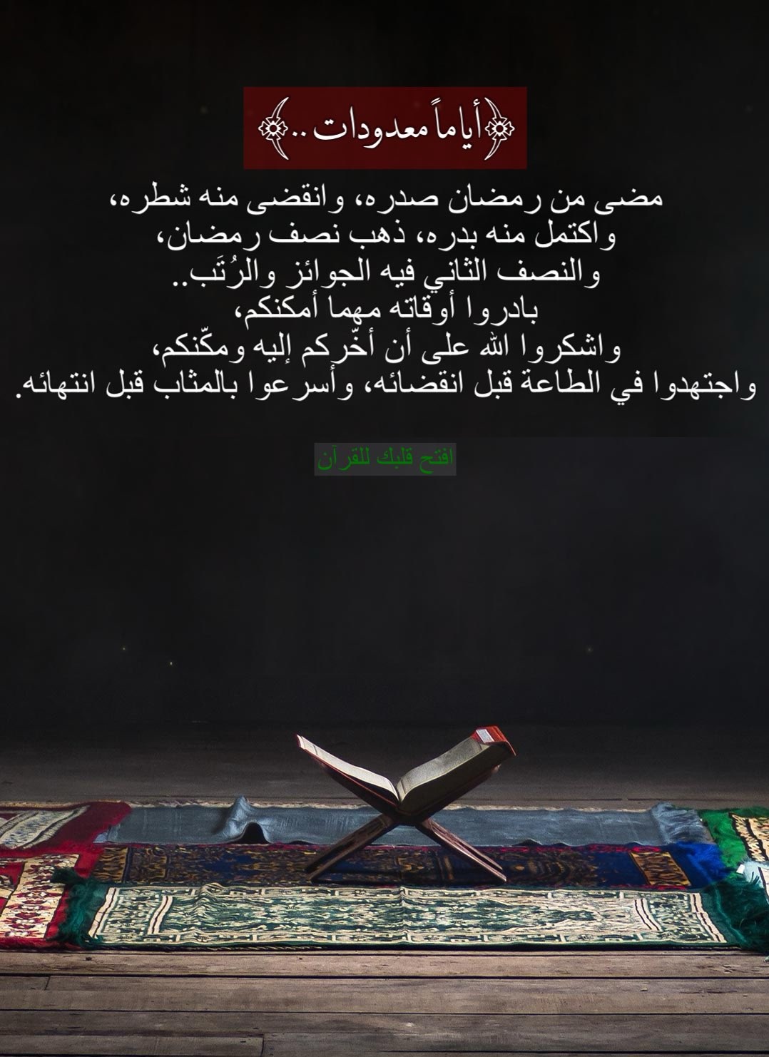 مضى من رمضان صدره، وانقضى منه شطره، واكتمل منه بدره، ذهب نصف رمضان، والنصف الثاني فيه الجوائز والرُتَب. بادروا أوقاته مهما أمكنكم، واشكروا الله على أن أخَركم إليه ومكّنكم، واجتهدوا في الطاعة قبل انقضائه، وأسرعوا بالمثاب قبل انتهائه.