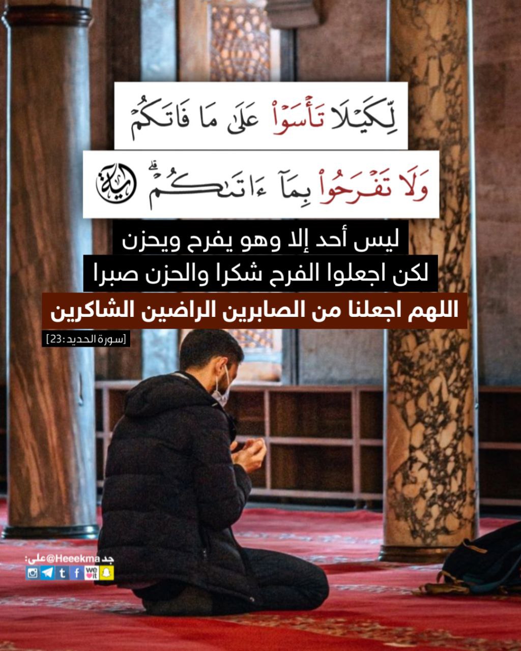 ﴿لِّكَيْلَا تَأْسَوْا عَلَى مَا فَاتَكُمْ وَلَا تَفْرَحُوا بِمَا آتَاكُمْ وَاللَّهُ لَا يُحِبُّ كُلَّ مُخْتَالٍ فَخُورٍ﴾