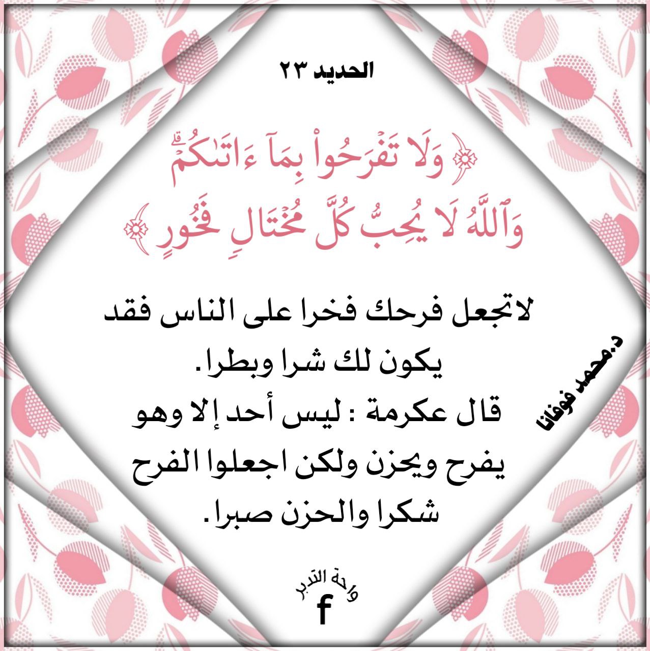 لا تجعل فرحك فخرا على الناس فقد يكون لك شرا وبطرا. قال عكرمة: ليس أحد إلا وهو يفرح ويحزن، ولكن اجعلوا الفرح شكراً والحزن صبراً، اللهم اجعلنا من الصابرين الراضين الشاكرين.
