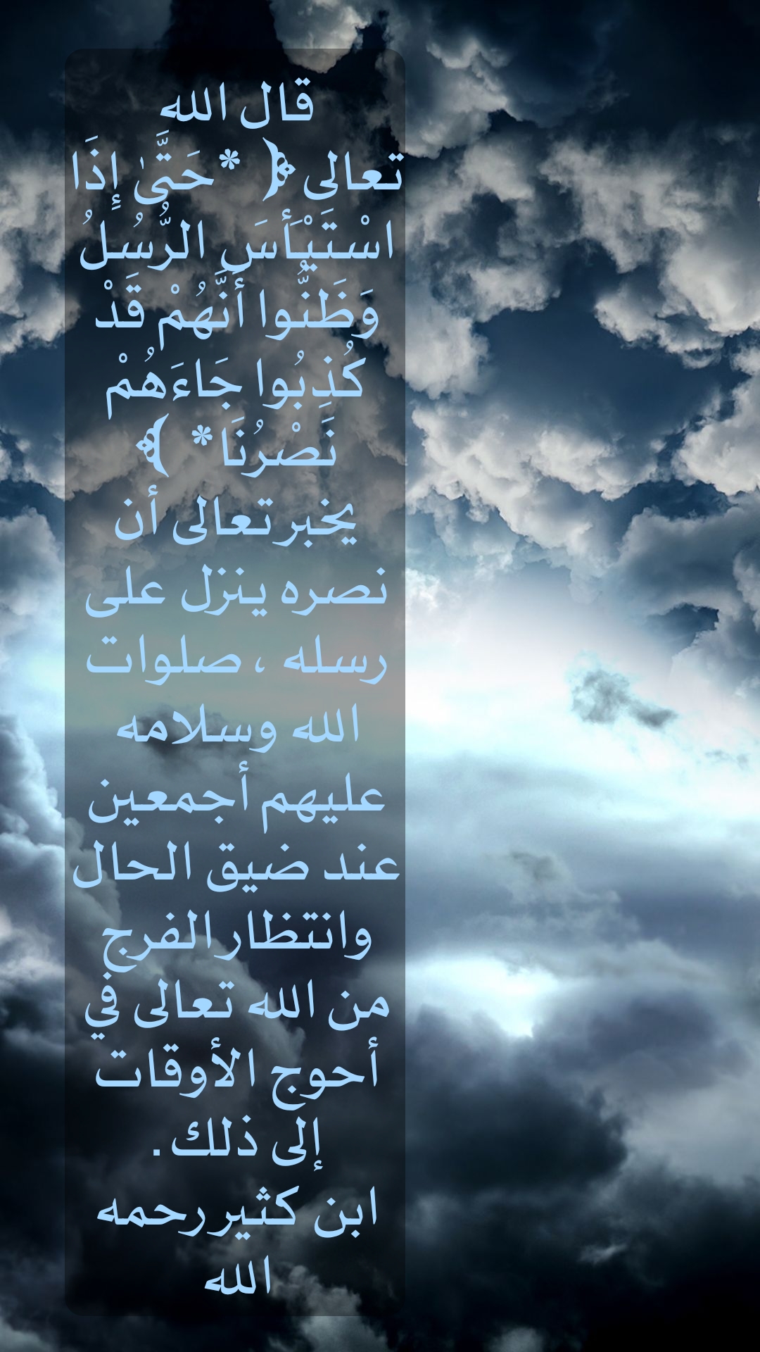 قال الله تعالى ( حَتَّى إِذَا اسْتَيْأَسَ الرُّسُلُ وَظَنُّوا أَنَّهُمْ قَدْ كَذِبُوا جَاءَهُمْ نَصْرُنَا ) يخبر تعالى أن نصره ينزل على رسله ، صلوات الله وسلامه عليهم أجمعين عند ضيق الحال وانتظار الفرج من الله تعالى في أحوج الأوقات إلى ذلك .