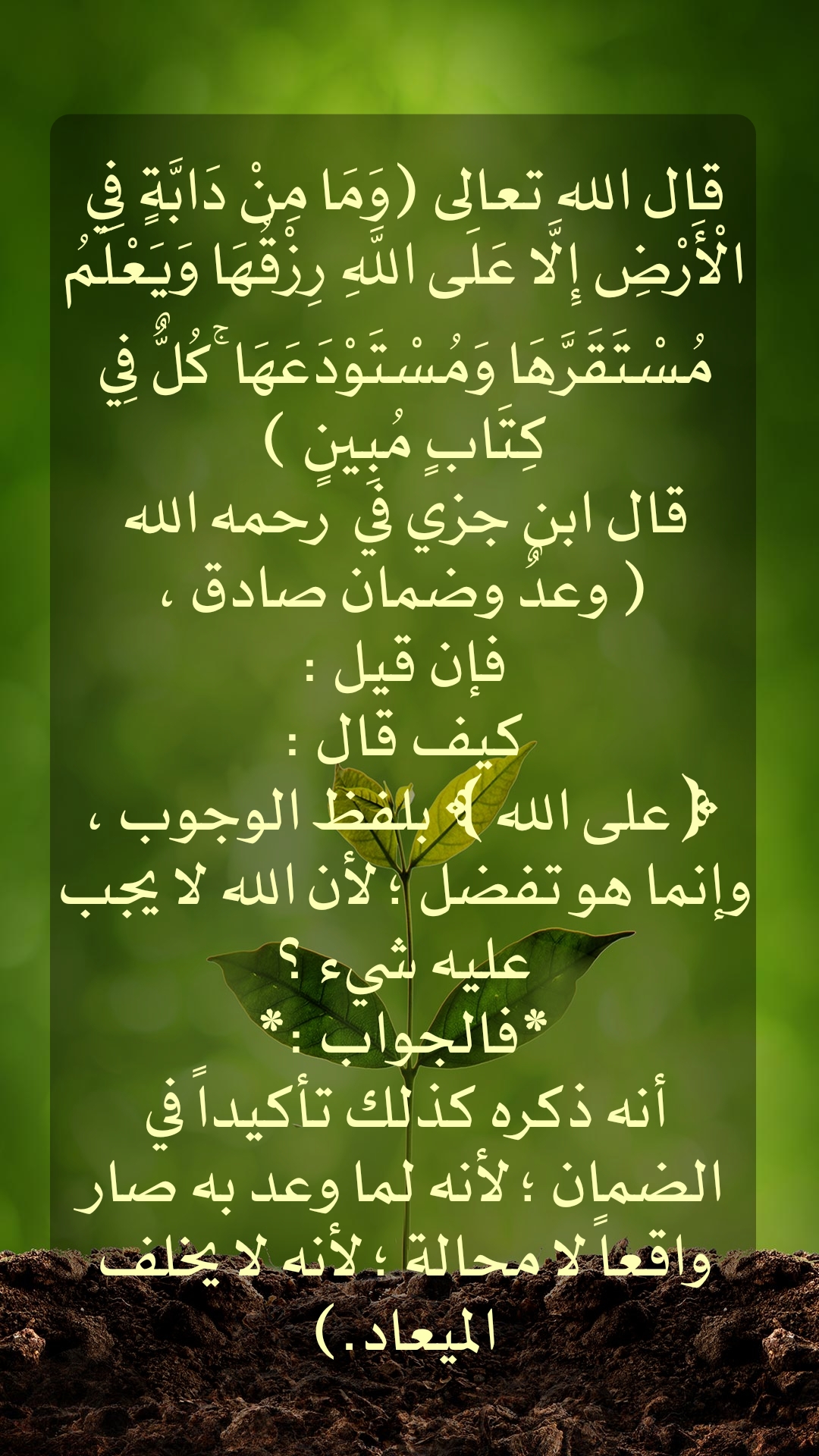 قال الله تعالى ( وَمَا مِنْ دَابَّةٍ فِي الْأَرْضِ إِلَّا عَلَى اللَّهِ رِزْقُهَا وَيَعْلَمُ مُسْتَقَرَّهَا وَمُسْتَوْدَعَهَا كُلٌّ فِي كِتَابٍ مُبِينٍ )
