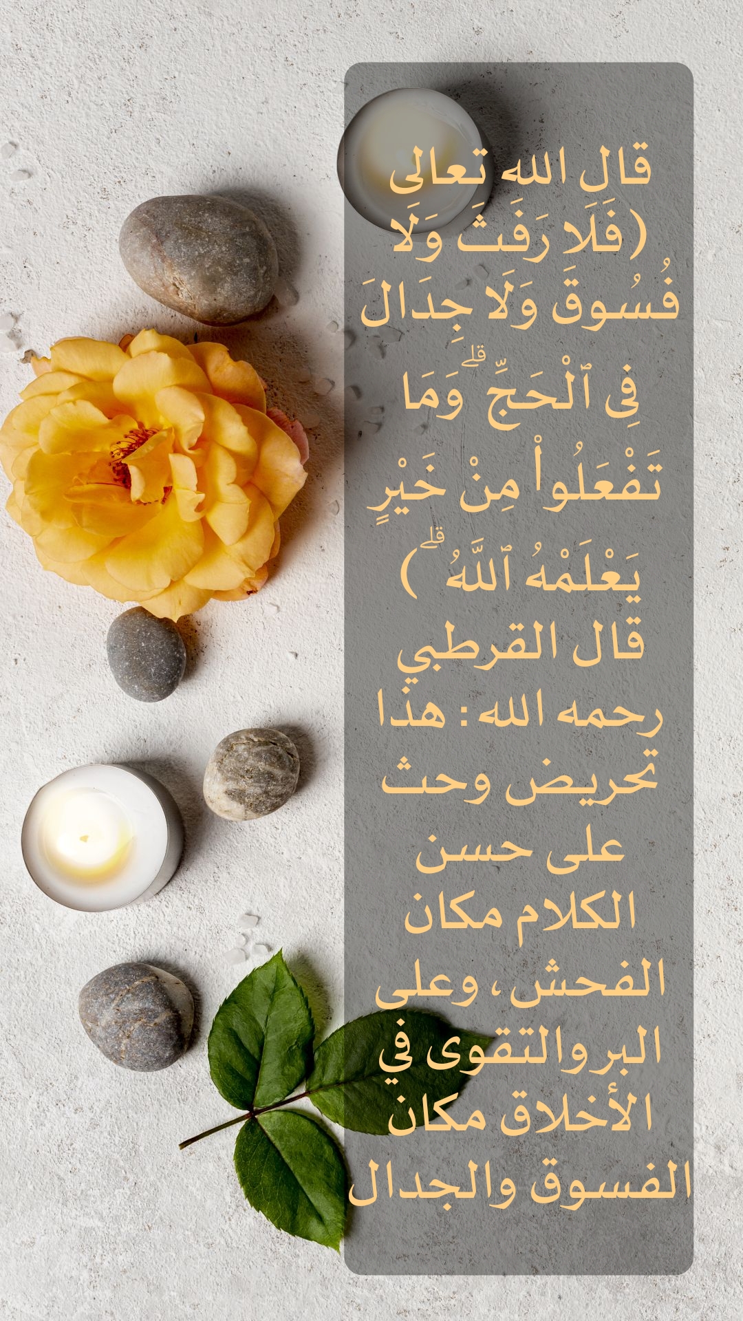 قال الله تعالى (فَلَا رَفَثَ وَلَا فُسُوقَ وَلَا جِدَالَ فِي الْحَجِّ وَمَا تَفْعَلُوا مِنْ خَيْرٍ يَعْلَمُهُ اللَّهُ )