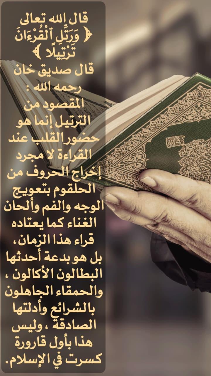 • "المقصود من الترتيل إنما هو حضور القلب عند القراءة لا مجرد إخراج الحروف من الحلقوم بتعويج الوجه والفم وألحان الغناء كما يعتاده قراء هذا الزمان بل هو بدعة أحدثها البطالون الأكالون ، والحمقاء الجاهلون بالشرائع وأدلتها الصادقة، وليس هذا بأول قارورة كسرت في الإسلام."