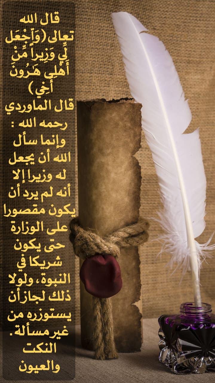 • "وإنما سأل الله أن يجعل له وزيرا إلا أنه لم يرد أن يكون مقصورا على الوزارة حتى يكون شريكا في النبوة، ولولا ذلك لجاز أن يستوزره من غير مسألة."