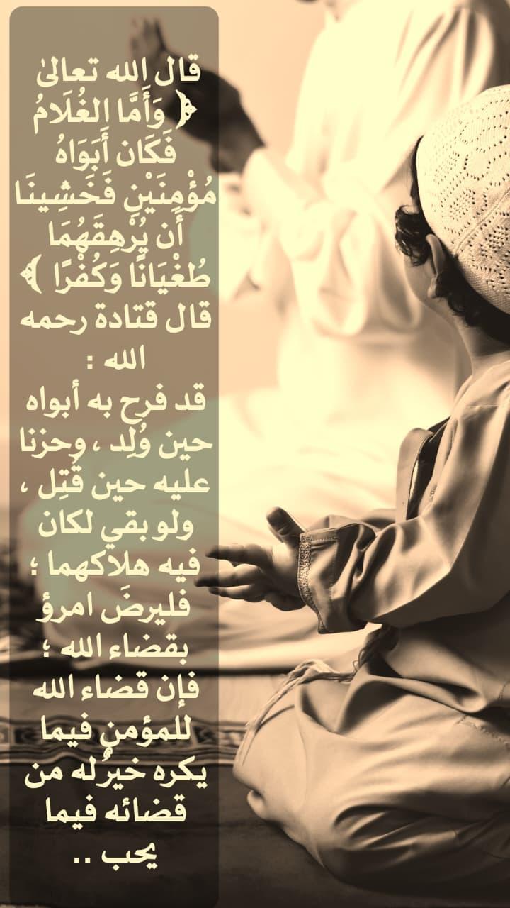 • قد فرح به أبواه حين ولد ، وحزنا عليه حين قتل، ولو بقي لكان فيه هلاكهما ؛ فليرض امرؤٌ بقضاء الله ؛ فإن قضاء الله للمؤمن فيما يكره خير له من قضائه فيما يحب.