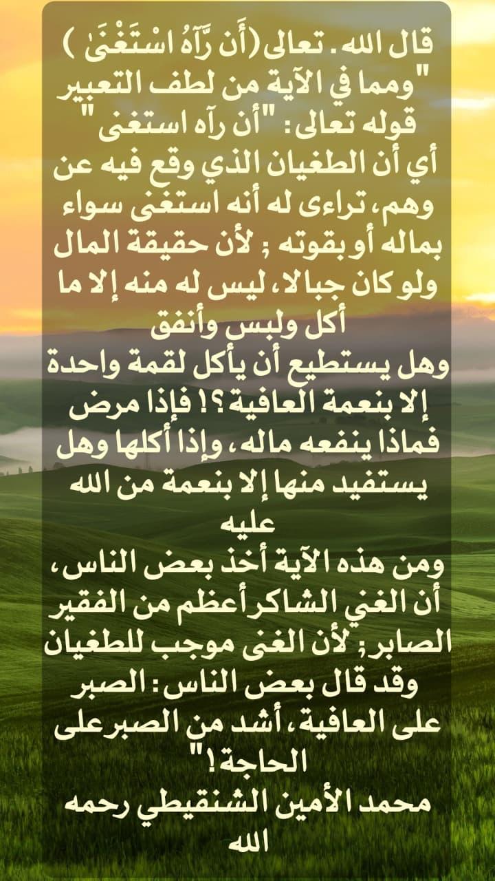 • ومما في الآية من لطف التعبير قوله تعالى : " أن رآه استغنى" أي أن الطغيان الذي وقع فيه عن وهم، تراءى له أنه استغنى سواء بماله أو بقوته ; لأن حقيقة المال ولو كان جبالا، ليس له منه إلا ما أكل ولبس وأنفق