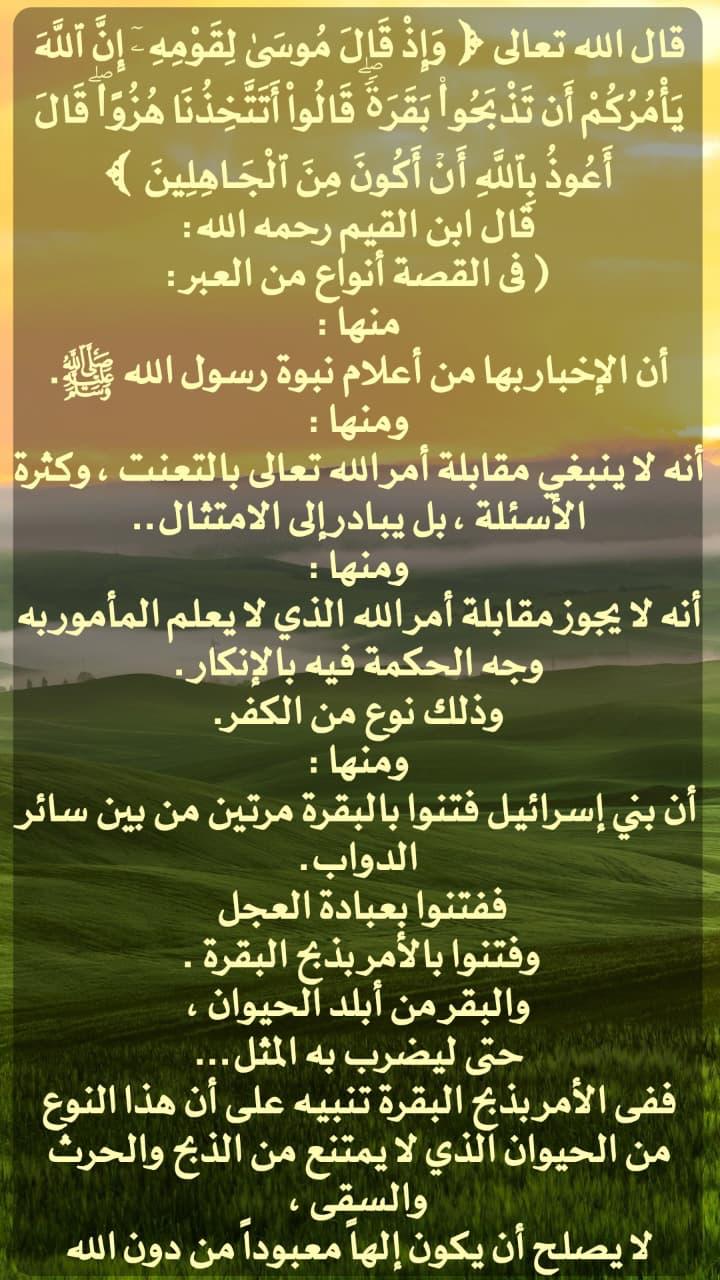 ﴿وَإِذْ قَالَ مُوسَى لِقَوْمِهِ إِنَّ اللَّهَ يَأْمُرُكُمْ أَن تَذْبَحُوا بَقَرَةً قَالُوا أَتَتَّخِذُنَا هُزُوًا قَالَ أَعُوذُ بِاللَّهِ أَنْ أَكُونَ مِنَ الْجَاهِلِينَ﴾