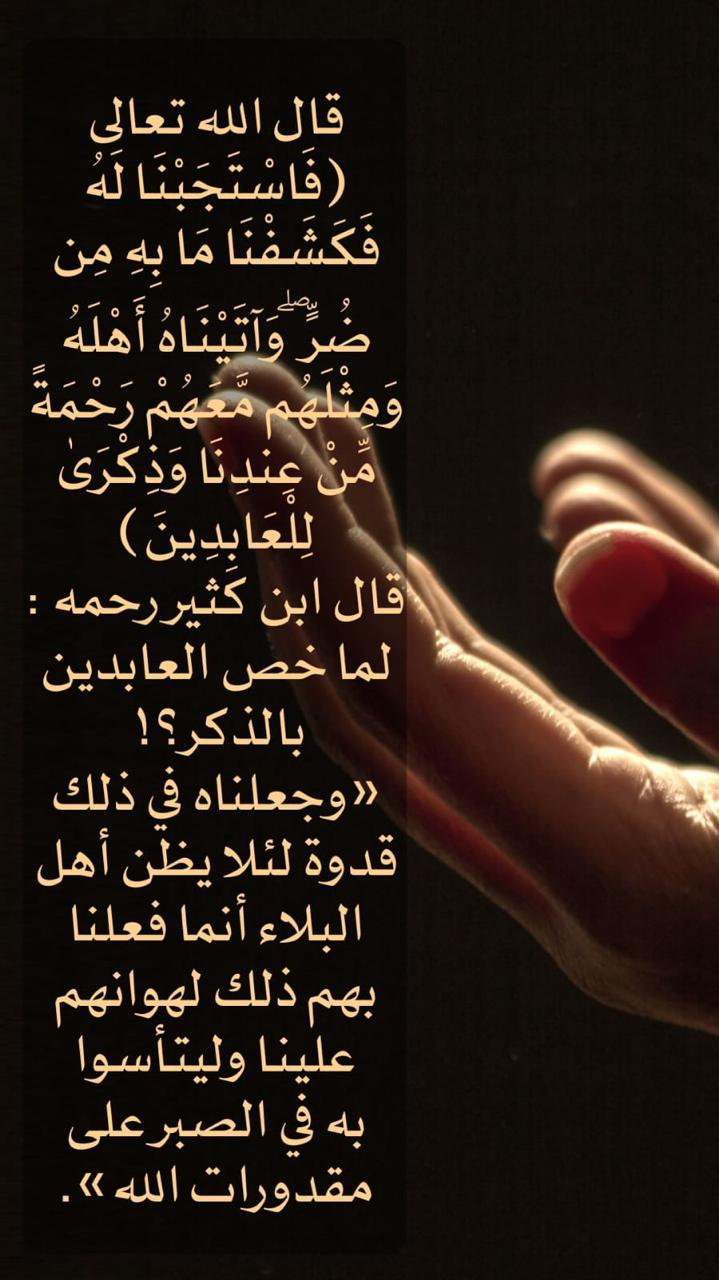﴿فَاسْتَجَبْنَا لَهُ فَكَشَفْنَا مَا بِهِ مِن ضُرٍّ وَآتَيْنَاهُ أَهْلَهُ وَمِثْلَهُم مَّعَهُمْ رَحْمَةً مِّنْ عِندِنَا وَذِكْرَى لِلْعَابِدِينَ﴾