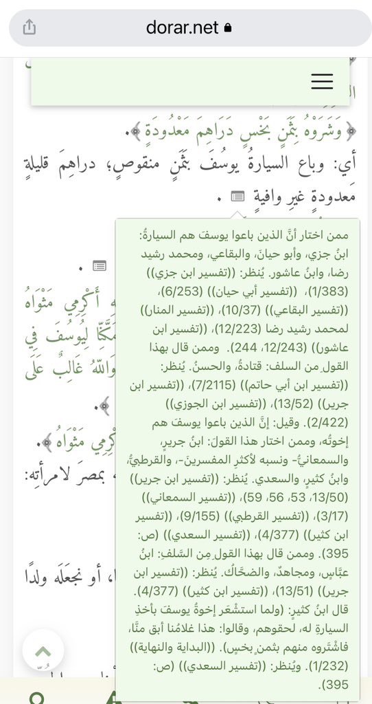 ج/ الذي يظهر لي رجحانه أن الذين باعوا يوسف هم الناس الذين مروا ووجدوه في البئر والذين وصفهم الله بالسيارة (وجاءت سيارة فأرسلوا واردهم)؛ لانسجام ذلك مع السياق، ولأن إخوته قد انصرفوا عنه بعد رميه في البئر ليبلغوا والدهم بأنه أكله الذئب، ولذلك تفاجأوا بحياته بعد ذلك في مصر واستغربوا، وهناك عدد كبير من المفسرين ذهبوا لما ذكرتم فعلاً وهو أن إخوته هم الذين باعوه بثمن بخس للسيارة، وأحسب أنهم استندوا في ذلك لبعض المرويات عن بني إسرائيل. وقد لخص الباحثون في التفسير المحرر القولين ومن قال بها في (الصورة المرفقة).