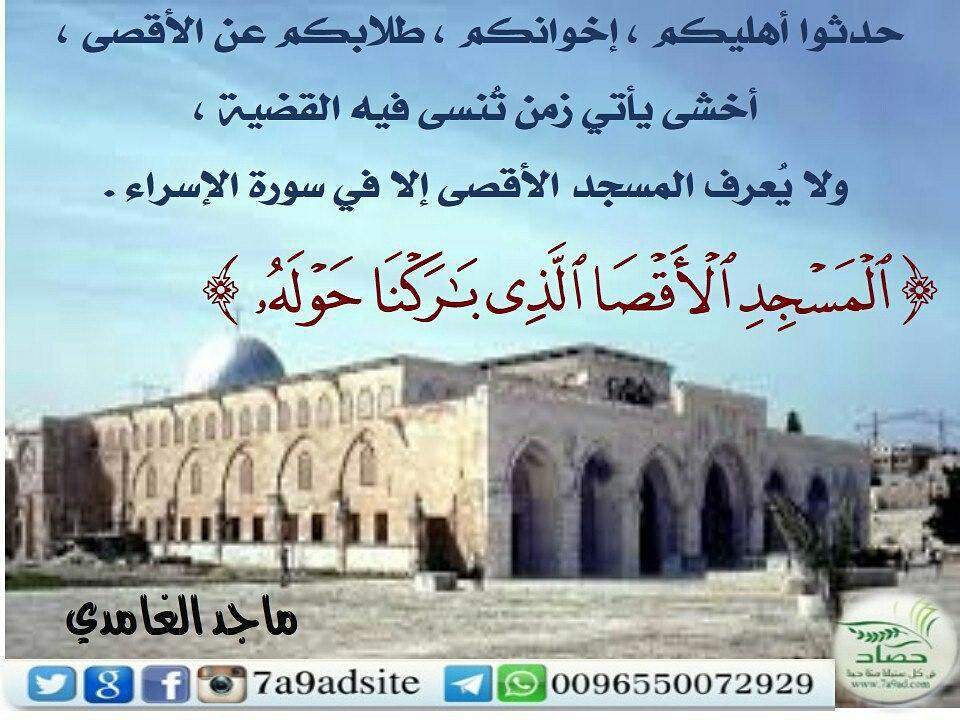 حدثوا اهليكم اخوانكم طلابكم عن الاقصي أخشي يأتي زمن تنسي فيه القضية ولا يعرف المسجد الاقصي الا في سورة الاسراء