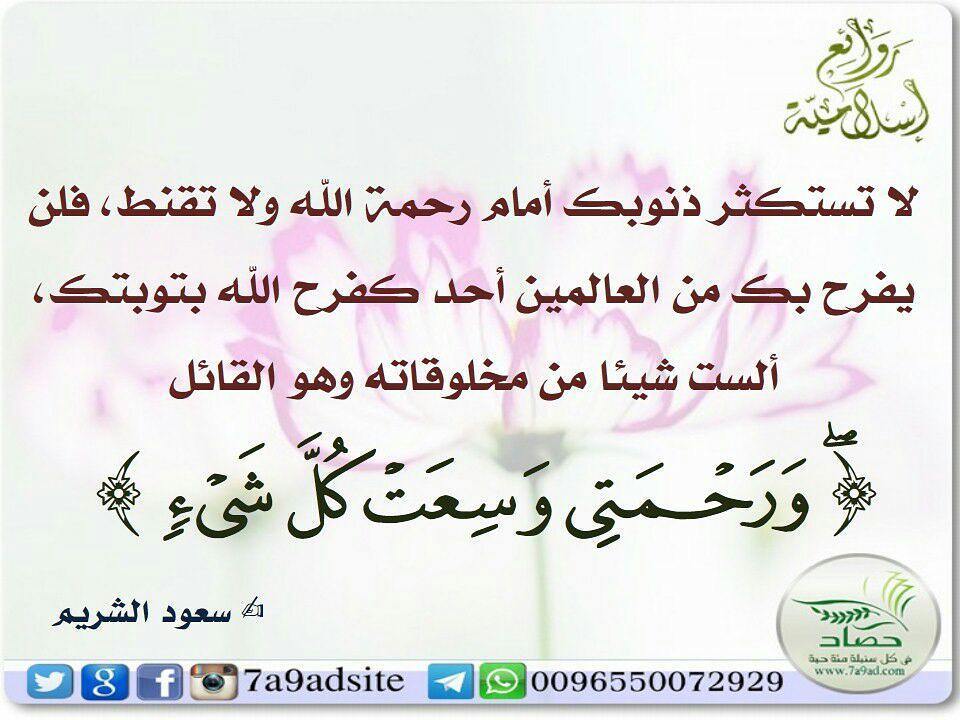 لا تستكثر ذنوبك أمام رحمة الله ولا تقنط، فلن يفرح بك من العالمين أحد كفرح الله بتوبتك، ألست شيئا من مخلوقاته وهو القائل (ورحمتي وسعت كل شيء) ؟!
