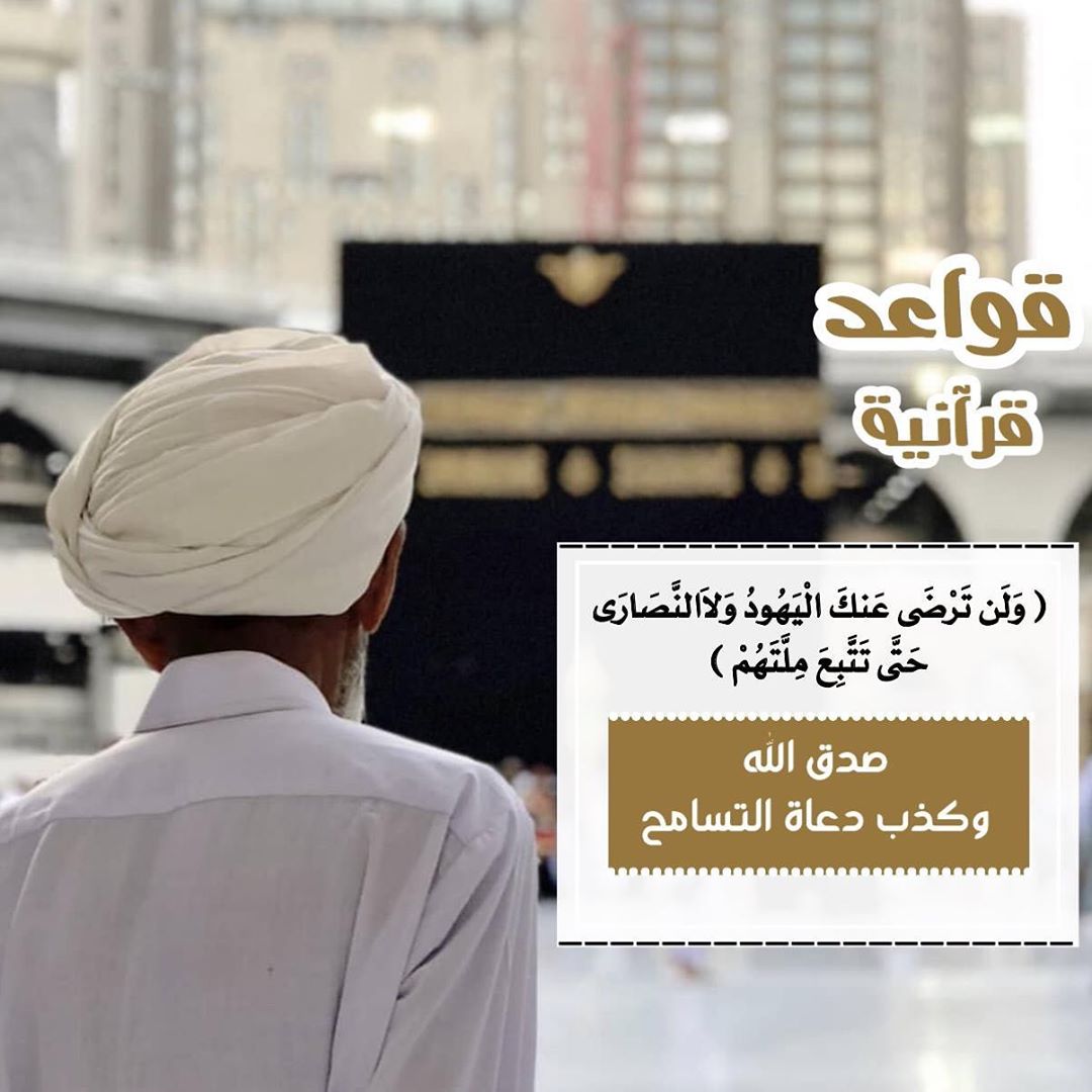 - ﴿وَلَن تَرْضَى عَنكَ الْيَهُودُ وَلَا النَّصَارَى حَتَّى تَتَّبِعَ مِلَّتَهُمْ قُلْ إِنَّ هُدَى اللَّهِ هُوَ الْهُدَى وَلَئِنِ اتَّبَعْتَ أَهْوَاءَهُم بَعْدَ الَّذِي جَاءَكَ مِنَ الْعِلْمِ مَا لَكَ مِنَ اللَّهِ مِن وَلِيٍّ وَلَا نَصِيرٍ ﴿١٢٠﴾ ﴾ [البقرة آية:١٢٠]