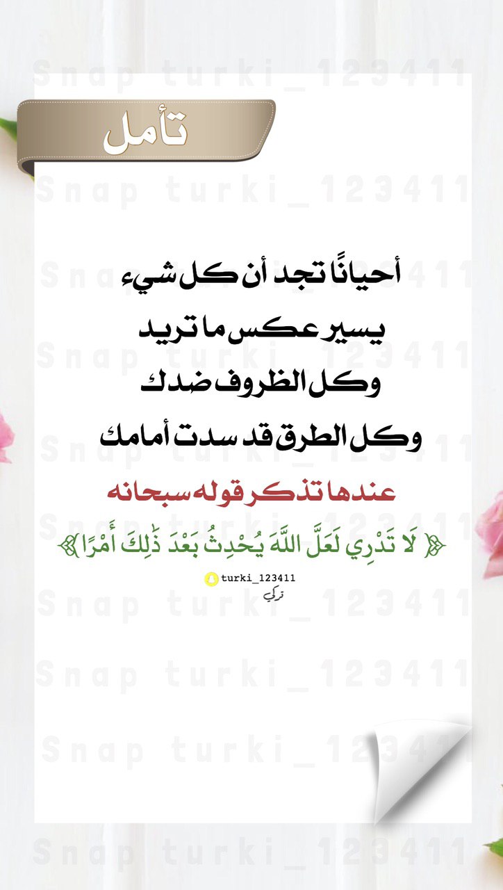 أحيانًا تجد أن كل شيء يسير عكس ما تريد وكل الظروف ضدك وكل الطرق قد سدت أمامك عندها تذكر قوله سبحانه ﴿لَا تَدْرِي لَعَلَّ اللَّهَ يُحْدِثُ بَعْدَ ذَلِكَ أَمْرًا﴾.