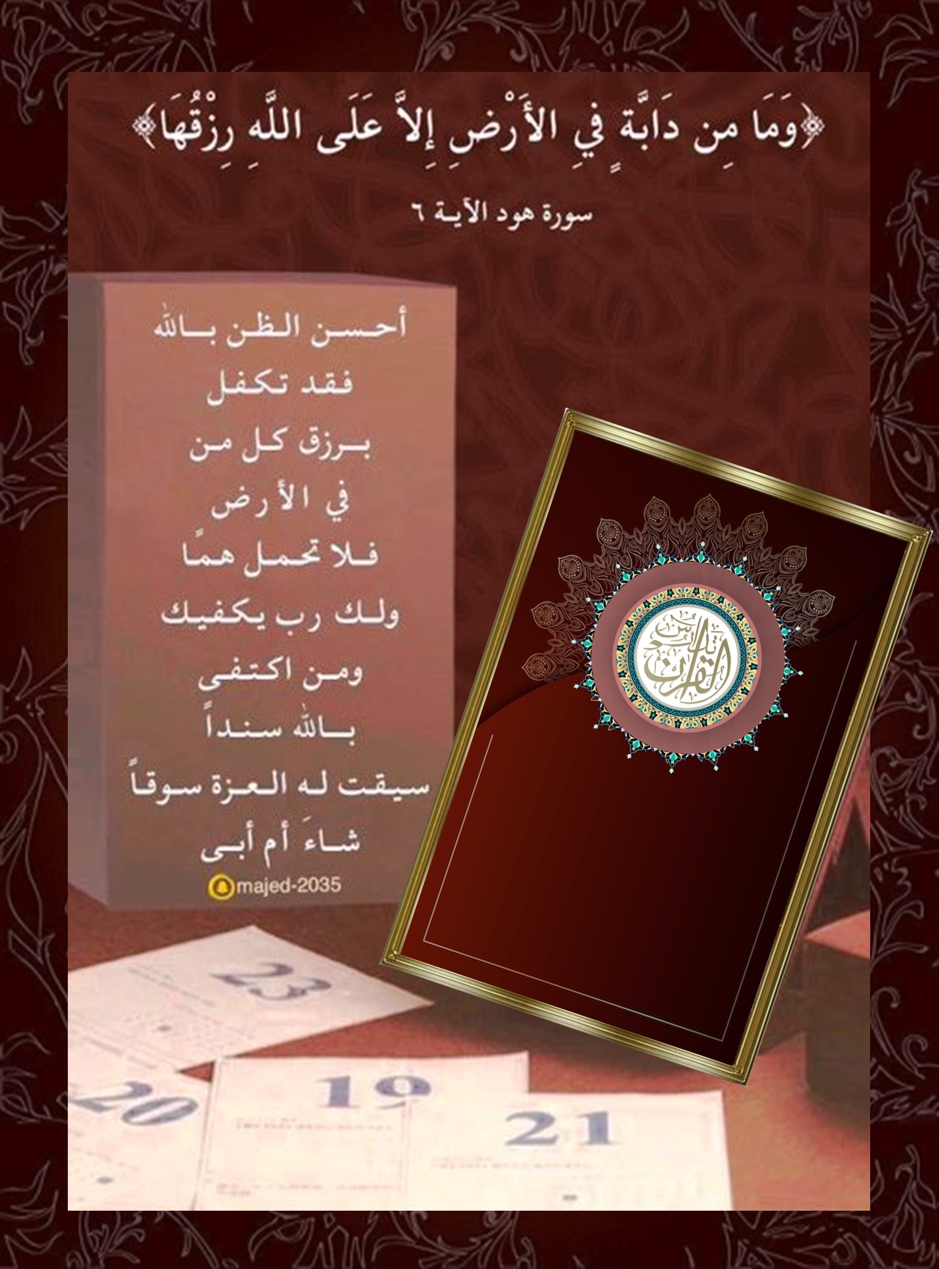 - ﴿وَمَا مِن دَابَّةٍ فِي الْأَرْضِ إِلَّا عَلَى اللَّهِ رِزْقُهَا وَيَعْلَمُ مُسْتَقَرَّهَا وَمُسْتَوْدَعَهَا كُلٌّ فِي كِتَابٍ مُّبِينٍ ﴿٦﴾ ﴾ [هود آية:٦]