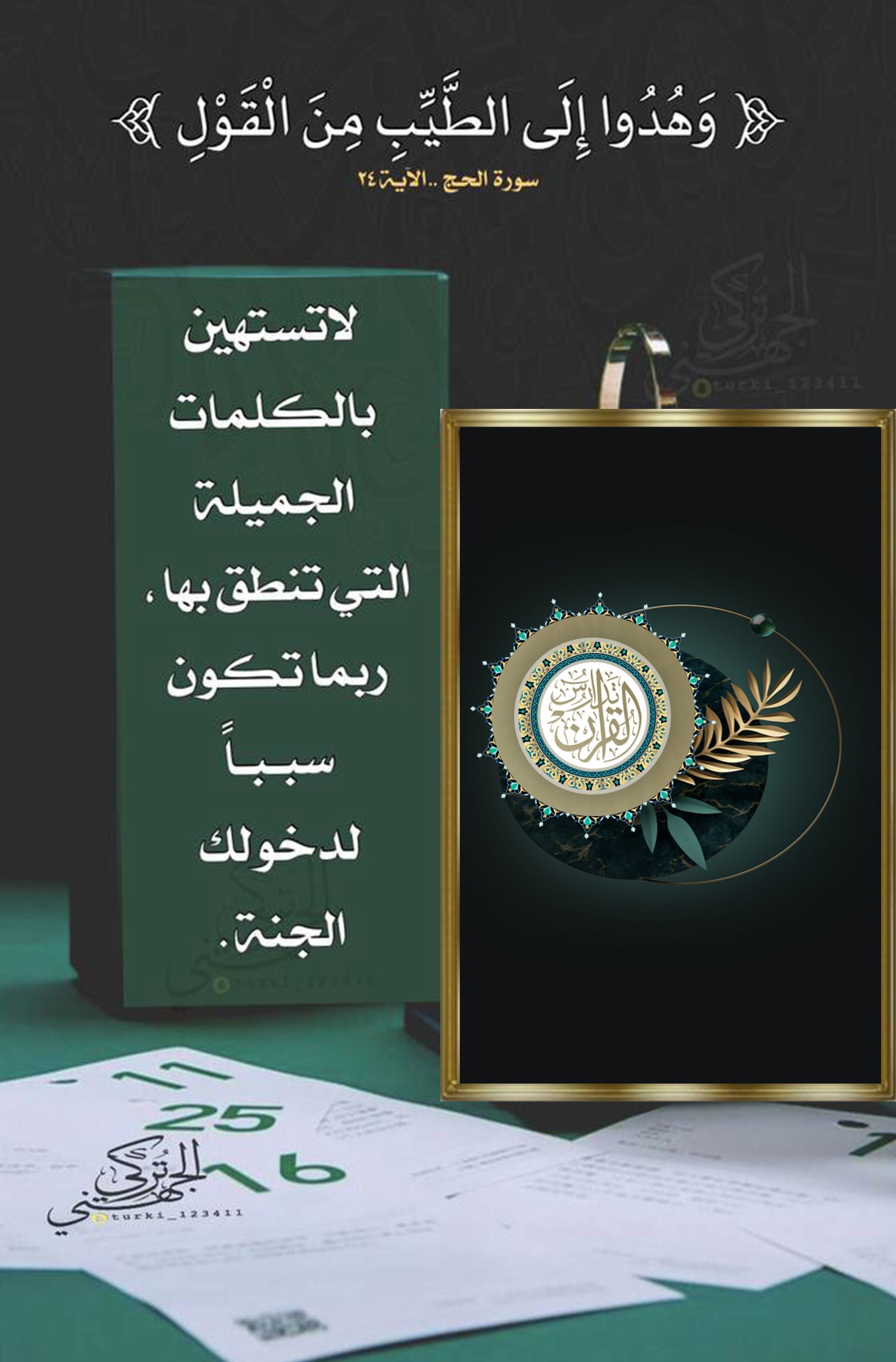 • ﴿وَهُدُوا إِلَى الطَّيِّبِ مِنَ الْقَوْلِ وَهُدُوا إِلَى صِرَاطِ الْحَمِيدِ﴾: • لا تستهين بالكلمات الجميلة التي تنطق بها، ربما تكون سبباً لدخولك الجنة.
