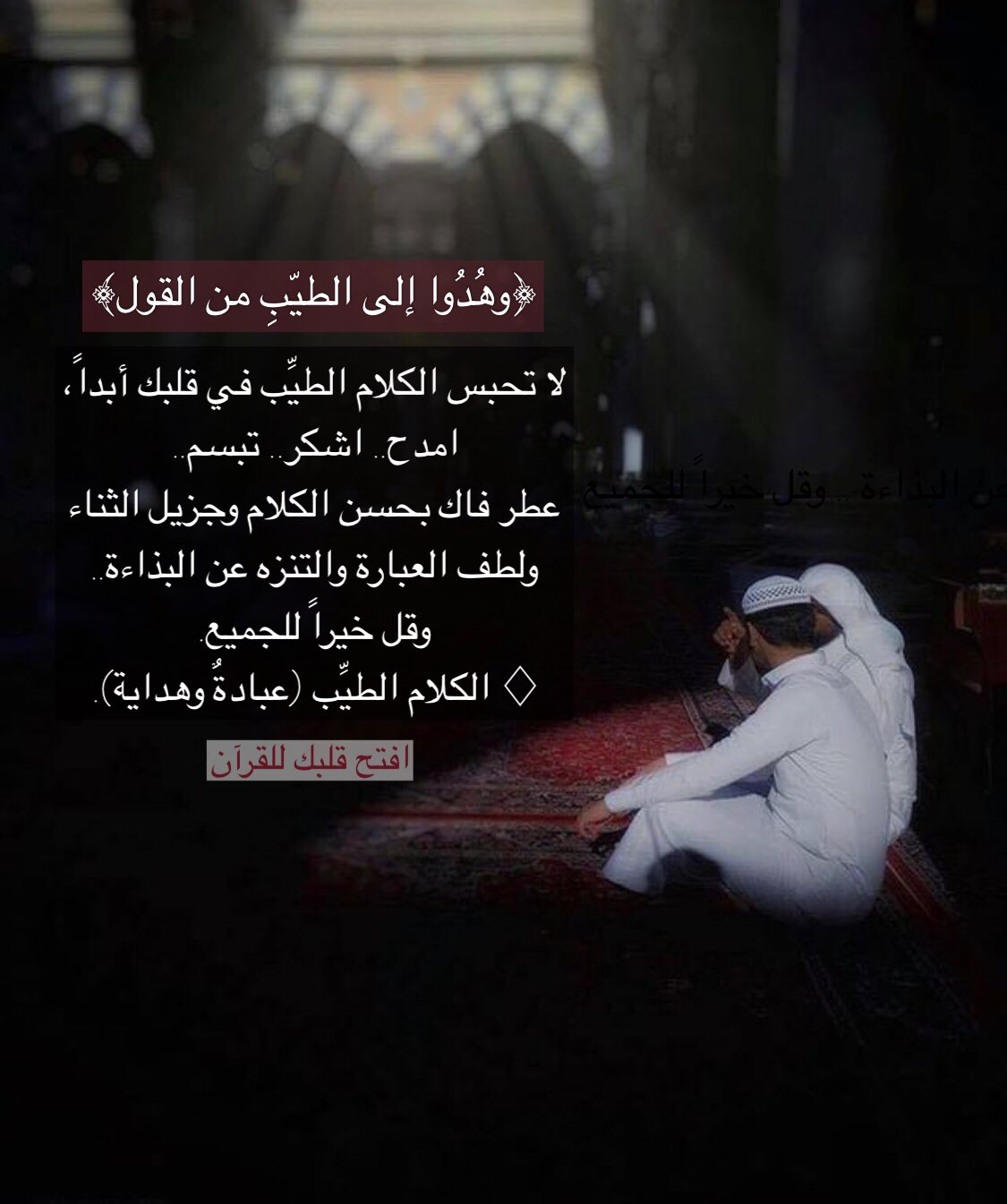 لا تحبس الكلام الطيب في قلبك أبداً، امدح .. اشكر .. تبسم .. عطر فاك بحسن الكلام وجزيل الثناء ولطف العبارة والتنزه عن البذاءة. وقل خيراً للجميع. الكلام الطيب (عبادةٌ وهداية).