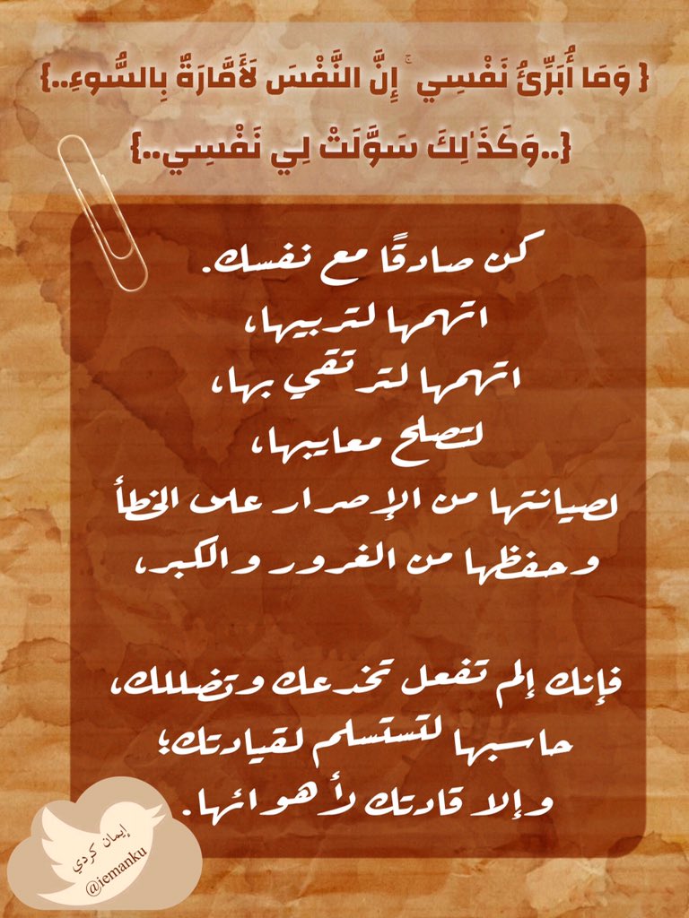 ﴿وَمَا أُبَرِّئُ نَفْسِي إِنَّ النَّفْسَ لَأَمَّارَةٌ بِالسُّوءِ﴾ • ﴿وَكَذَلِكَ سَوَّلَتْ لِي نَفْسِي﴾: