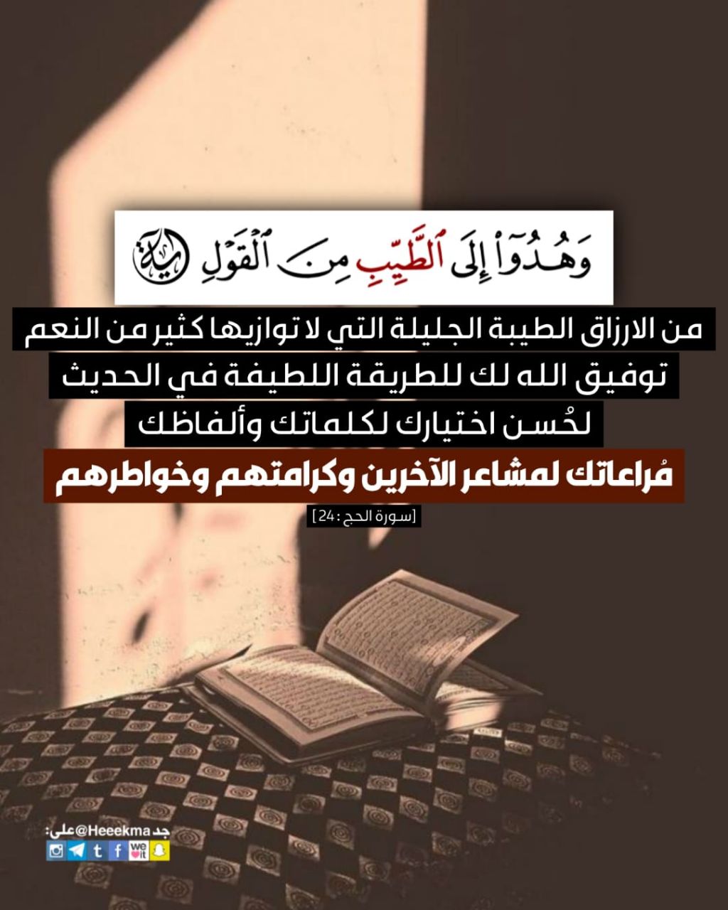 من الارزاق الطيبة الجليلة التي لا توازيها كثير من النعم .. توفيق الله لك للطريقة اللطيفة في الحديث .. لحُسن اختيارك لكلماتك وألفاظك .. مُراعاتك لمشاعر الآخرين وكرامتهم وخواطرهم.