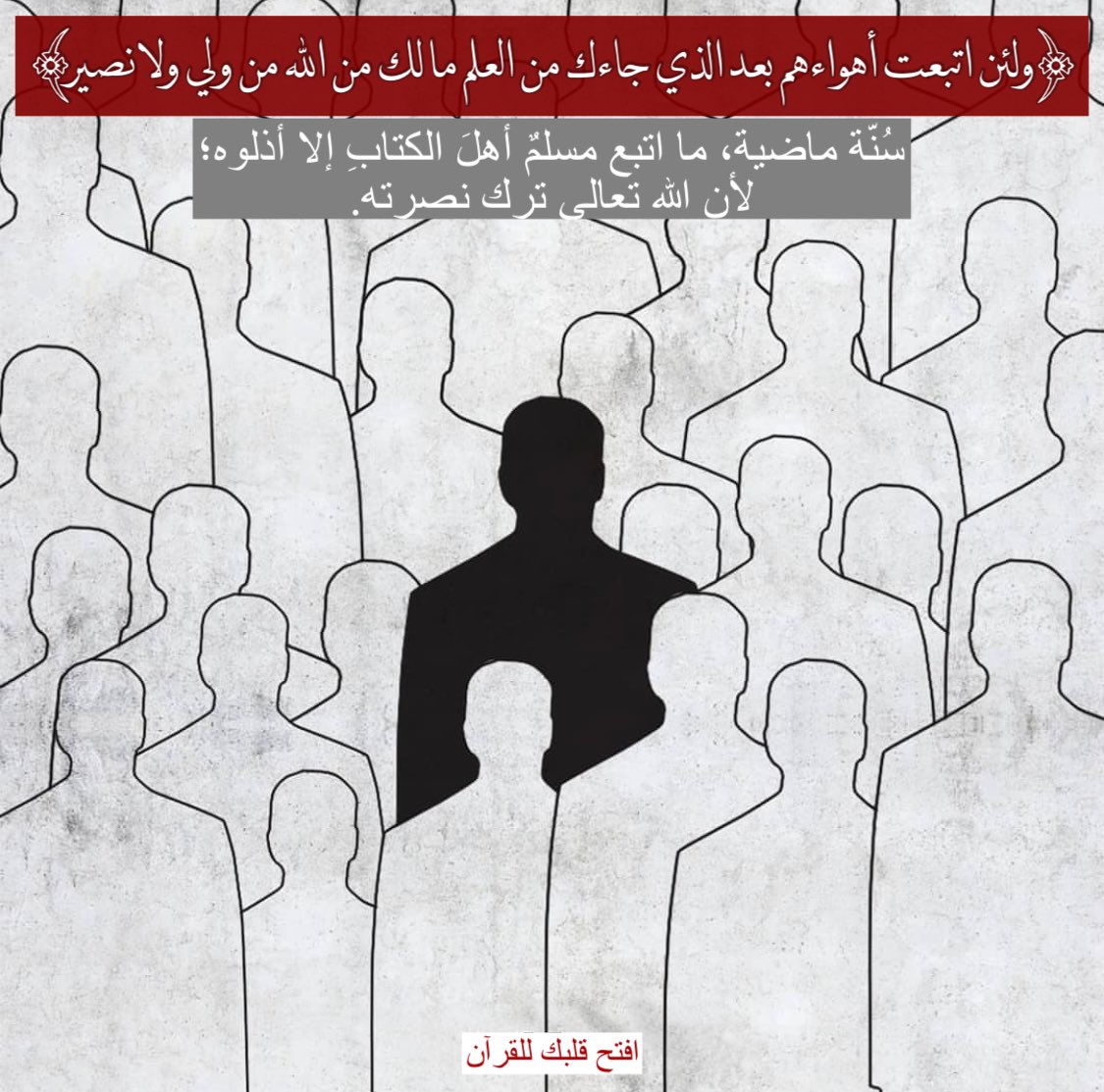 ﴿وَلَئِنِ اتَّبَعْتَ أَهْوَاءَهُم بَعْدَ الَّذِي جَاءَكَ مِنَ الْعِلْمِ مَا لَكَ مِنَ اللَّهِ مِن وَلِيٍّ وَلَا نَصِيرٍ﴾