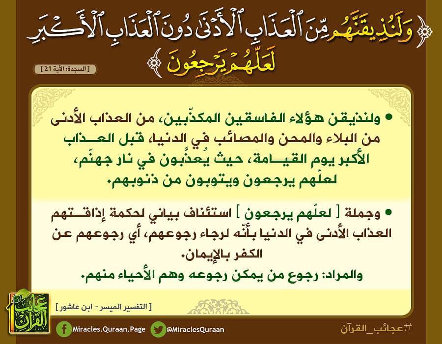- ﴿وَلَنُذِيقَنَّهُم مِّنَ الْعَذَابِ الْأَدْنَى دُونَ الْعَذَابِ الْأَكْبَرِ لَعَلَّهُمْ يَرْجِعُونَ ﴿٢١﴾ ﴾ [السجدة آية:٢١]